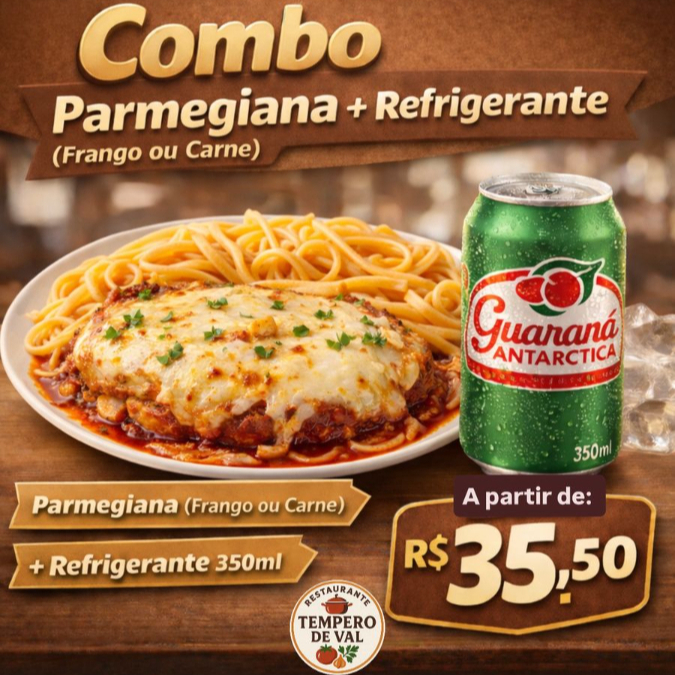 Parmegiana de Frango com macarrão espaguetti e acompanha um refrigerante de 350ml . Adicionar na observação