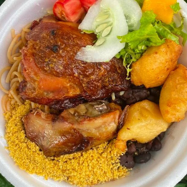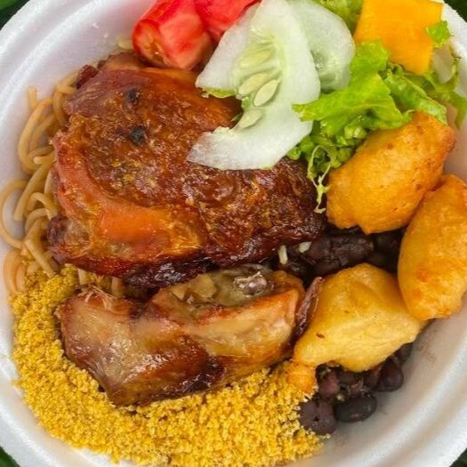Acompanha Arroz, Macarrão, Salada e farofa. O feijão de sua escolha (preto, mulato e macassar)