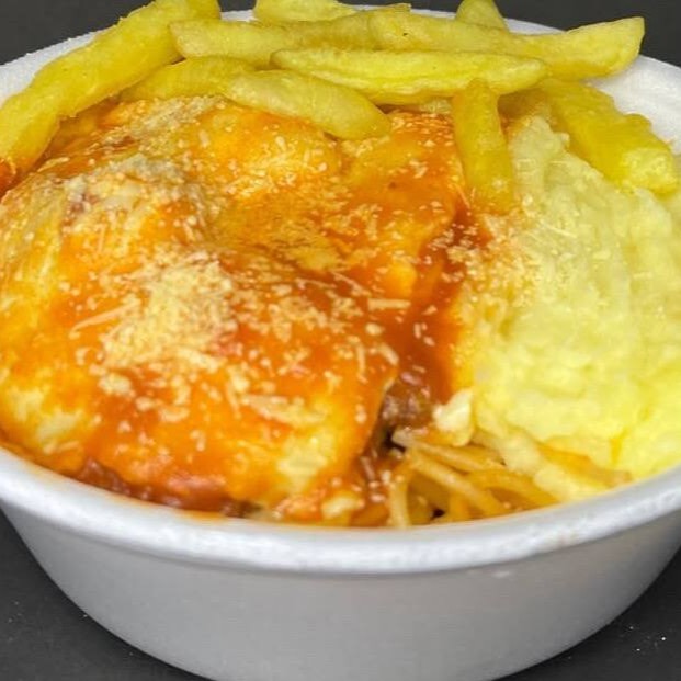 Delicioso filé empanado, coberto com molho de tomate, queijo derretido, uma à perfeição. Acompanhado de macarrão, purê de batata e batatas fritas. Uma combinação irresistível para o seu paladar!