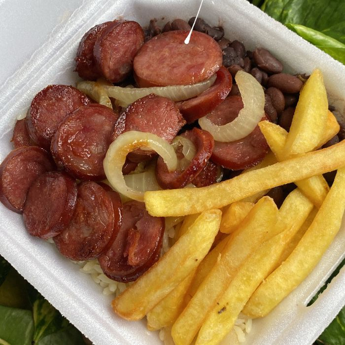Marmita (H2)Acompanha Arroz, Macarrão, Salada e farofa. O feijão de sua escolha (preto, mulato e macassar) Aproximadamente 500g
