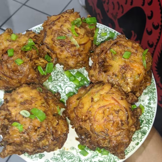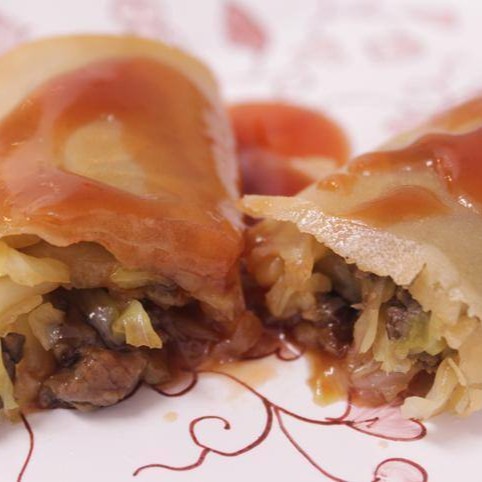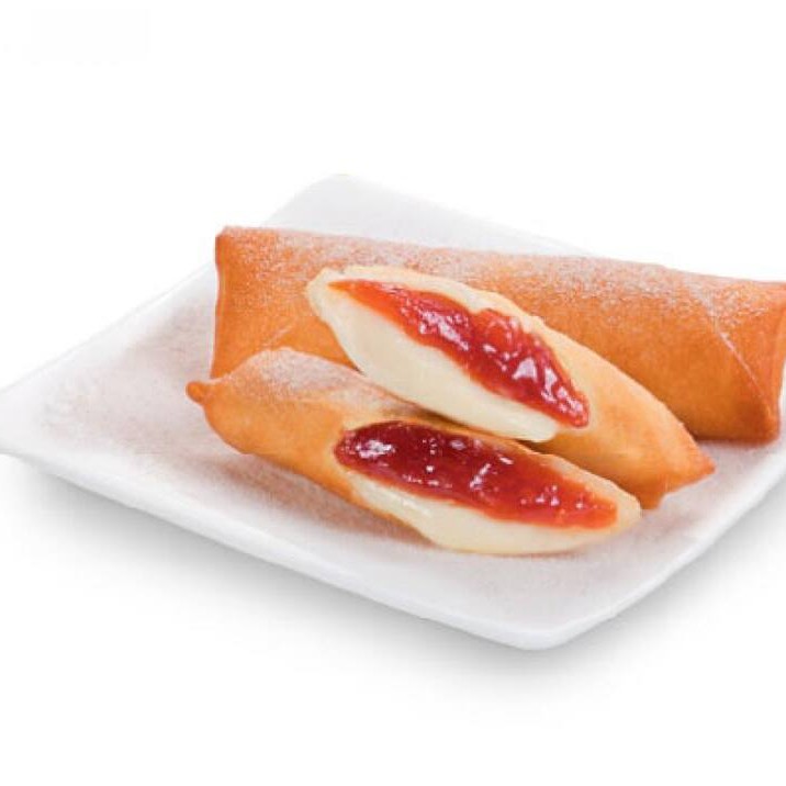 Feito com Legumes(repolho, cenoura e pimentão), Recheado com filé de camarão. Levemente melado ao trigo e fritado na gordura vegetal.