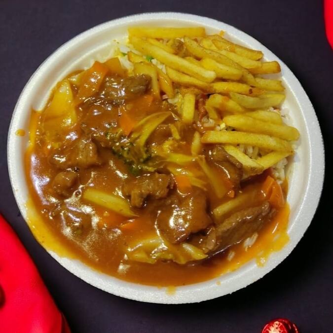 Carne fatiada ao curry com cebola. É um prato apimentado. Acompanha risoto (arroz, ovo, presunto, cenoura em cubo e cebolinha)