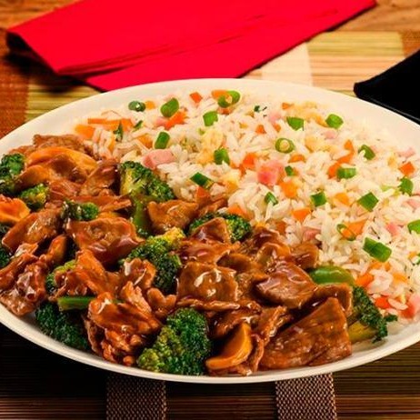 Carne fatiada com brócolis ao molho shoyu. Acompanha risoto (arroz, ovo, presunto, cenoura em cubinhos e cebolinha)