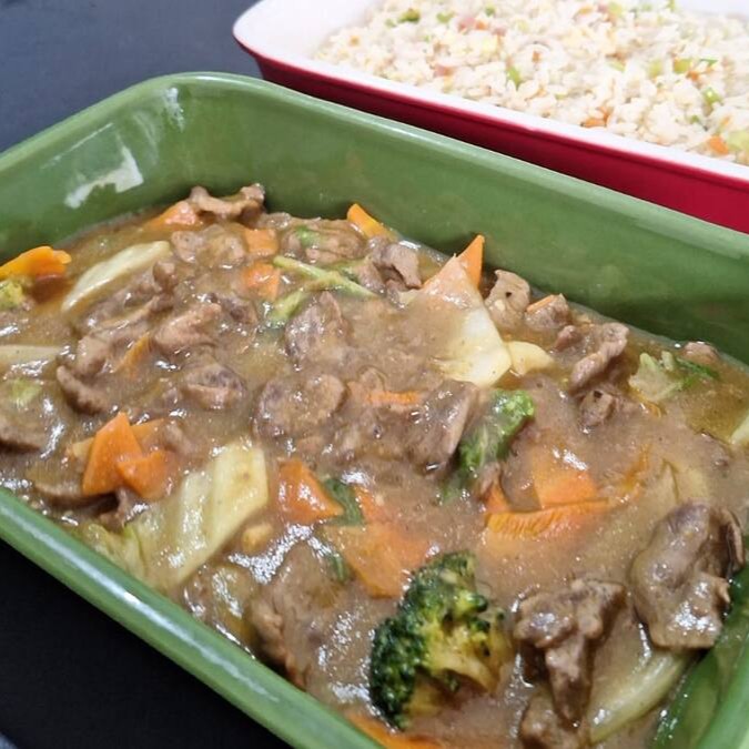 Carne com pimentão ao molho de soja (repolho, brócolis, cebola). Acompanha risoto (arroz, ovo, presunto, cenoura em cubinhos e cebolinha)