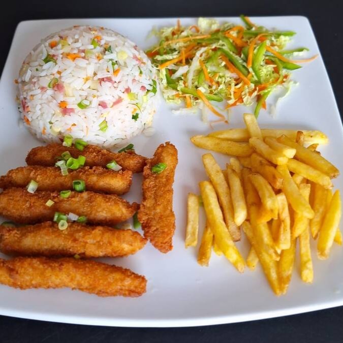 Sobre-coxa de frango fatiada, empanada e frita. Acompanha risoto (arroz, ovo, presunto, cenoura em cubo e cebolinha).