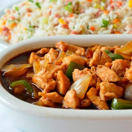 Cubos de peito de frango ao molho shoyu com pimentão e cebola. Acompanha risoto (arroz, ovo, presunto, cenoura em cubo e cebolinha)