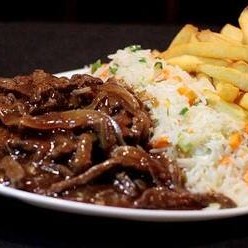 Carne fatiada com cebola ao molho de soja. Acompanha risoto (arroz, ovo, presunto, cenoura em cubinhos e cebolinha)