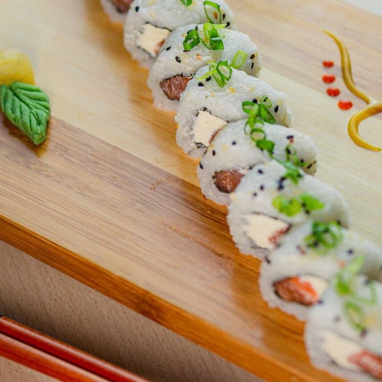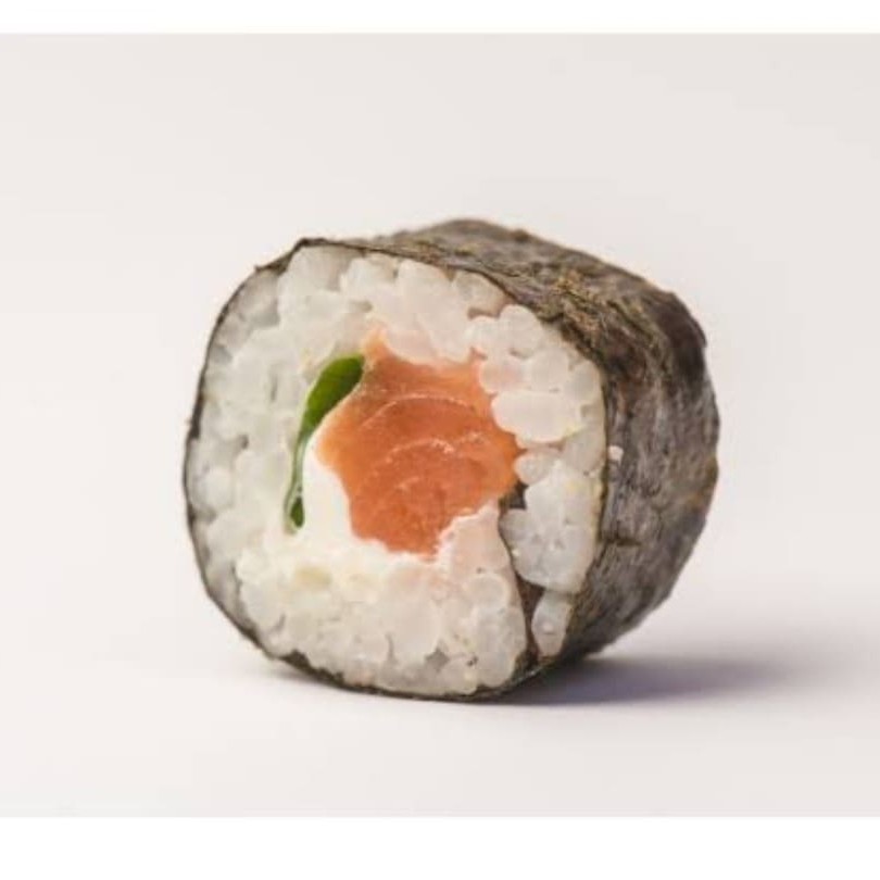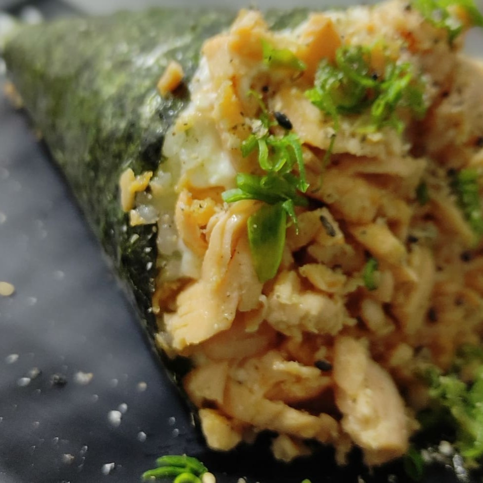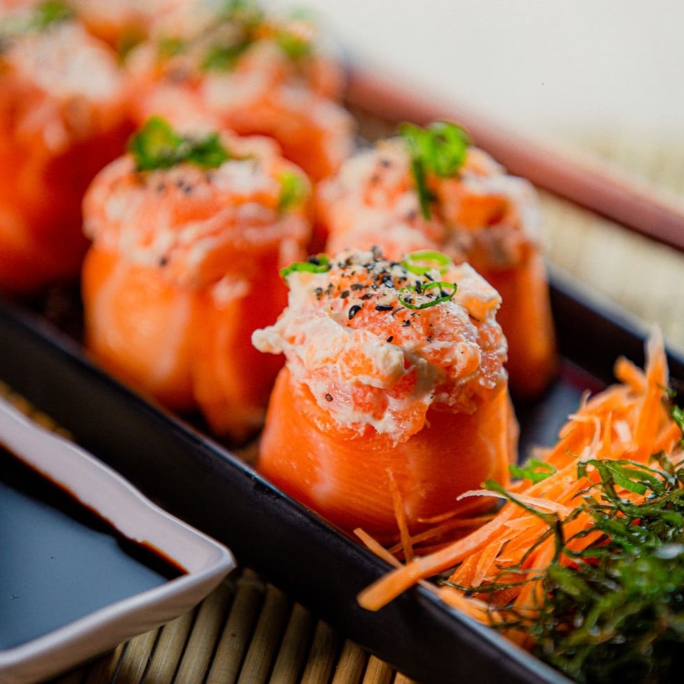 Arroz enrolado no salmão, pasta de salmão cebolinho.