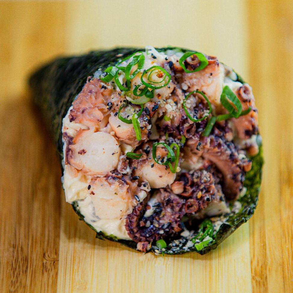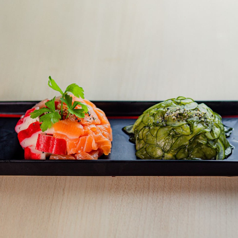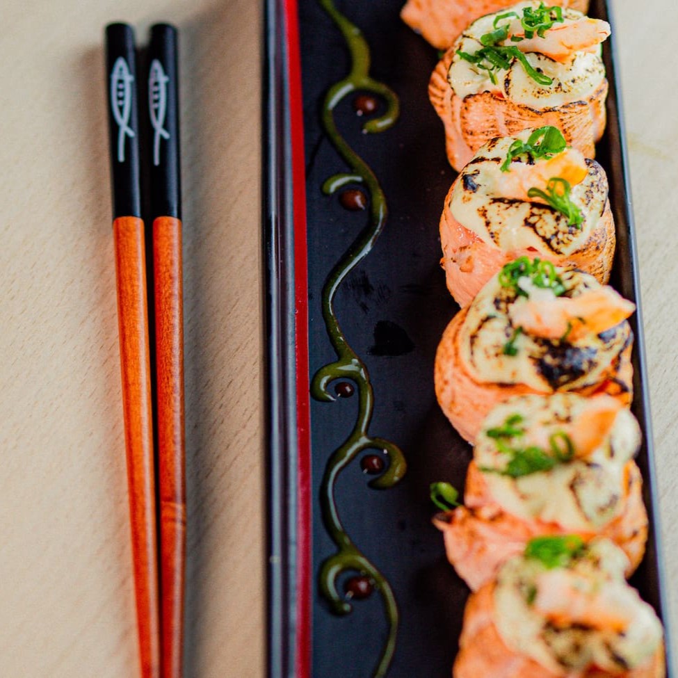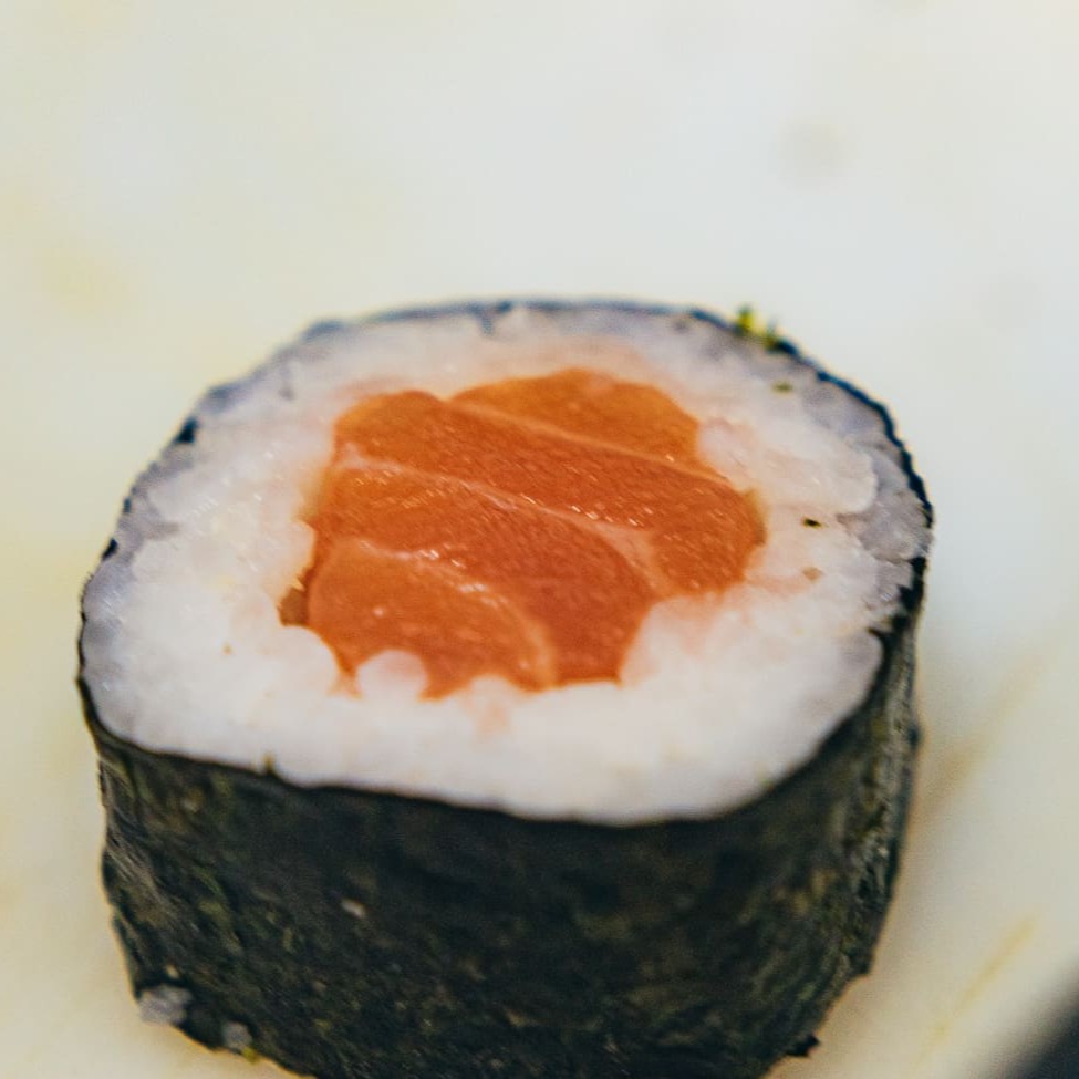 Arroz enrolado no salmão, pasta de salmão cebolinho.