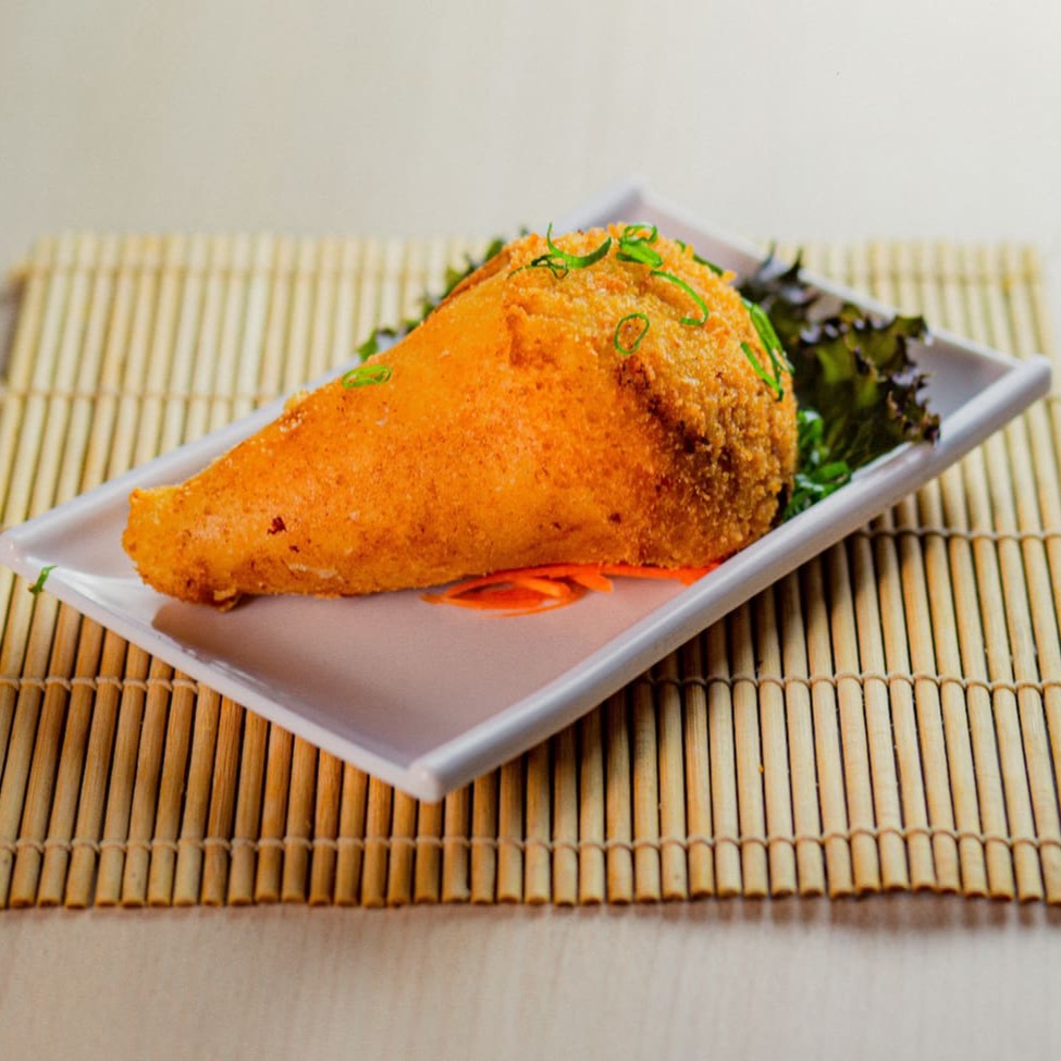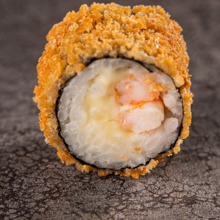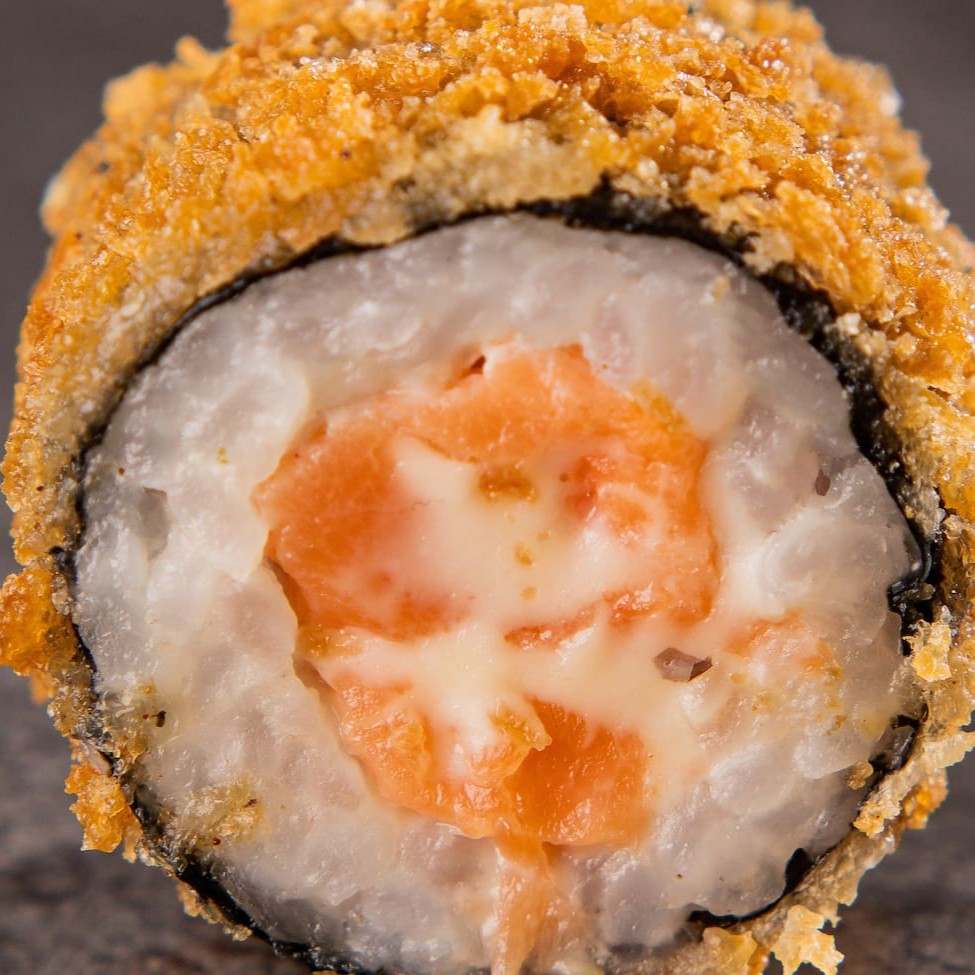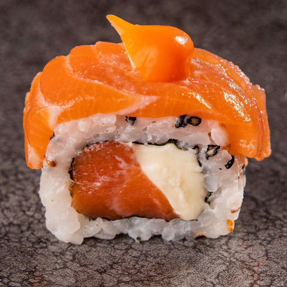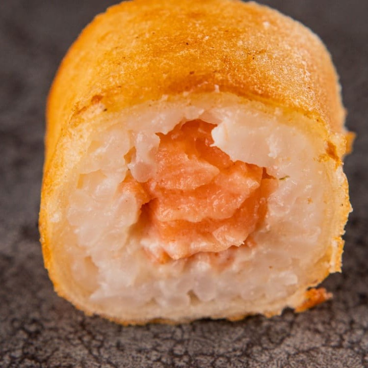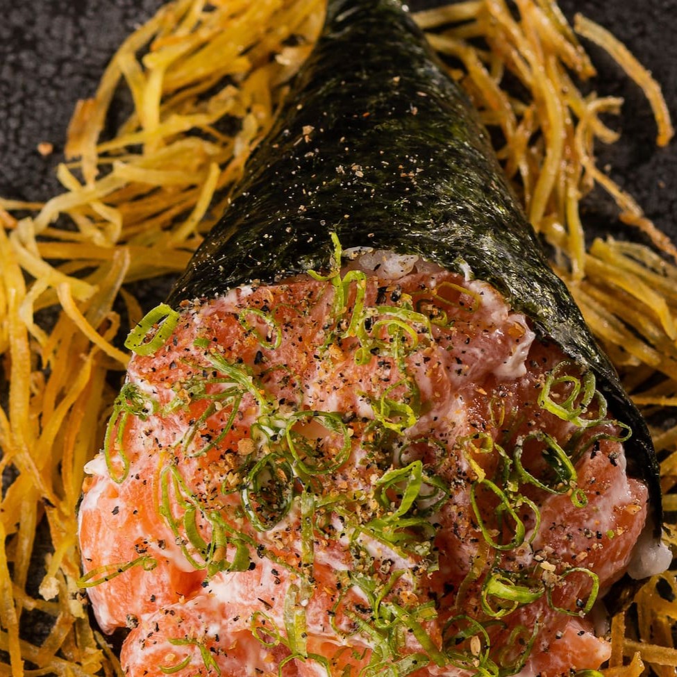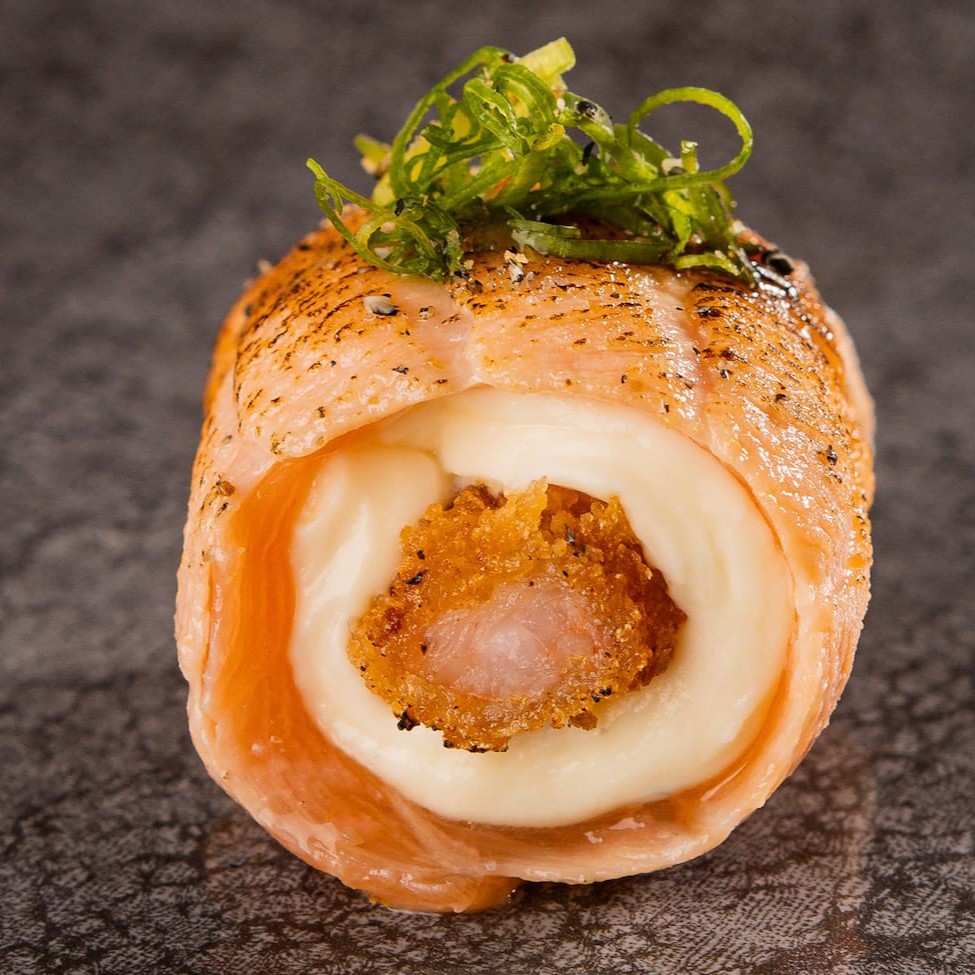 Salmão maçaricado, arroz, camarão crocante, cream cheese e cebolinha
