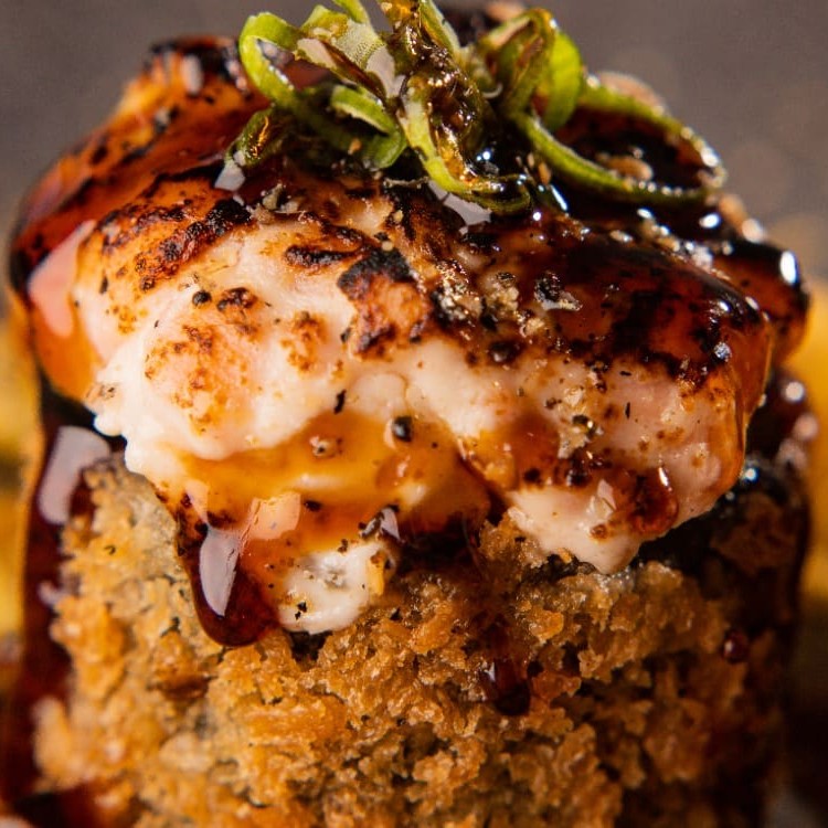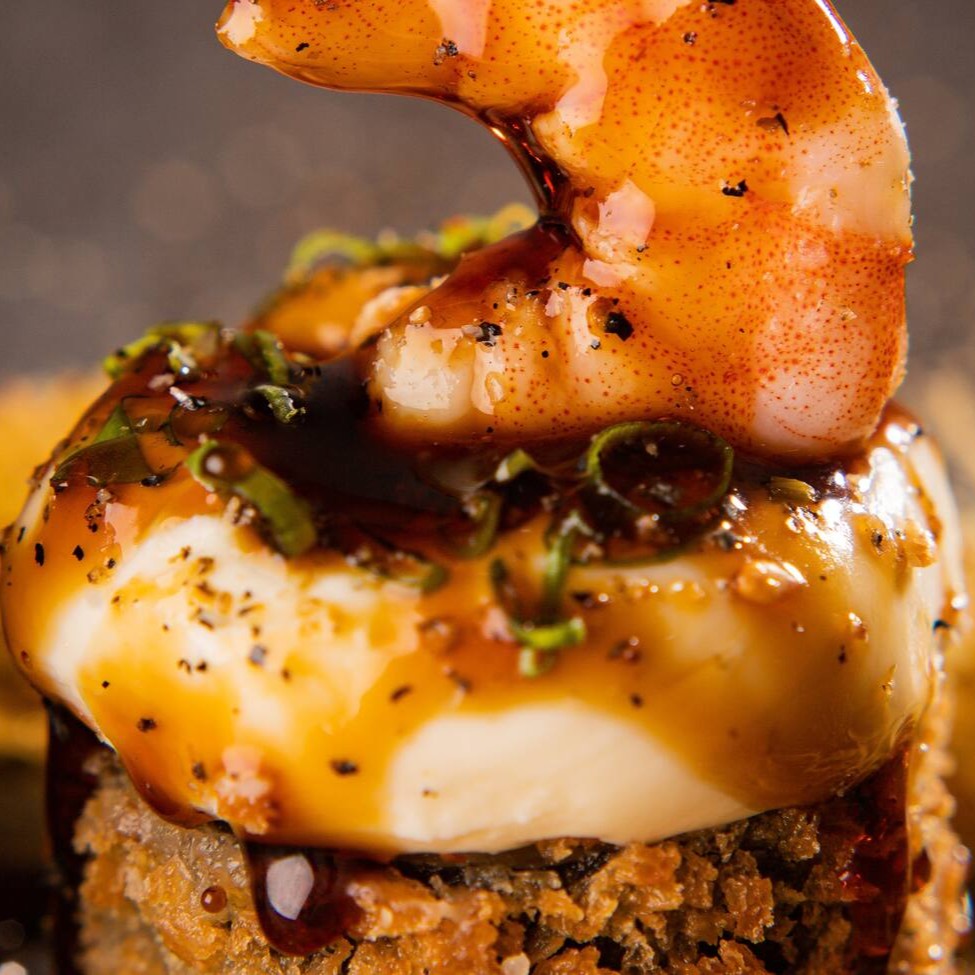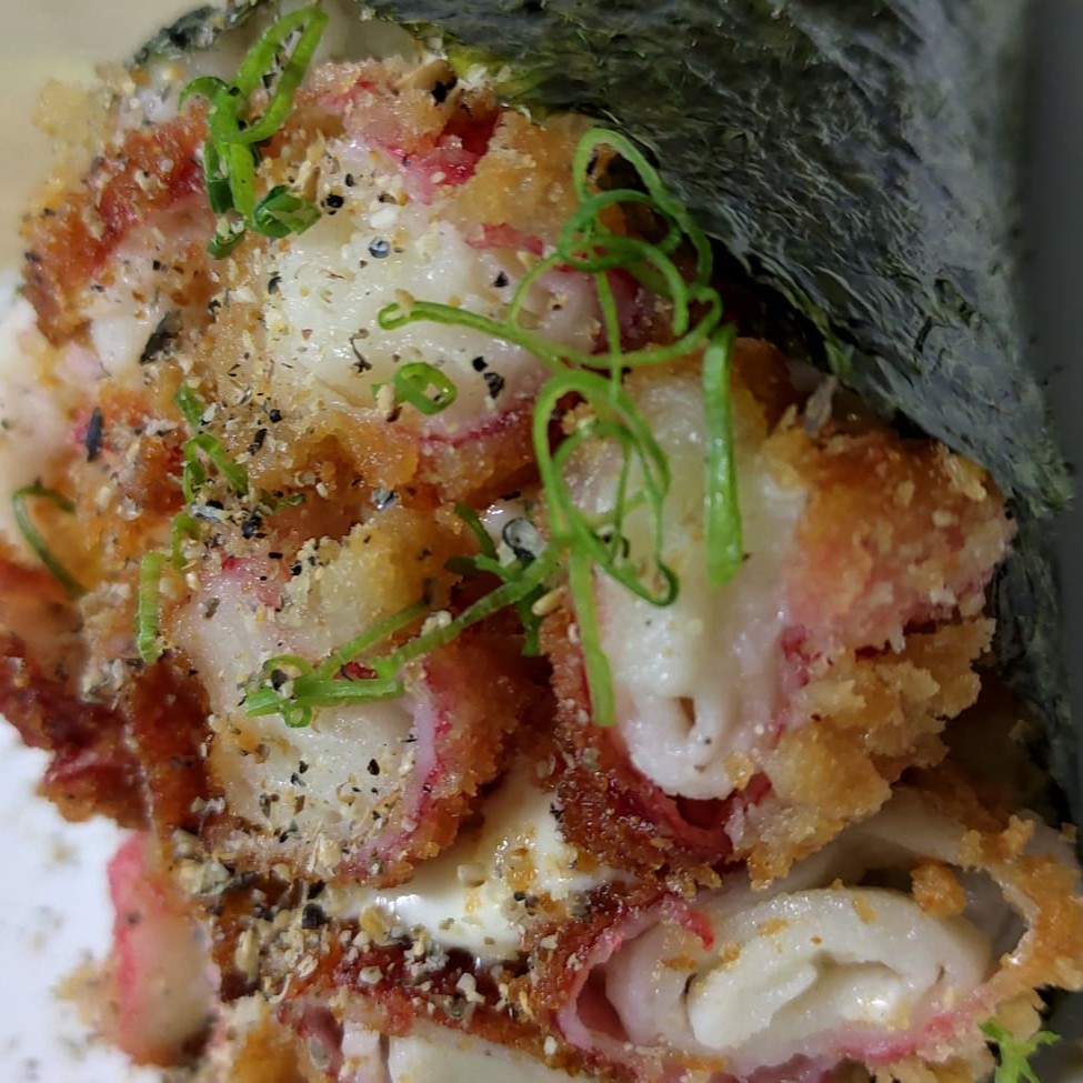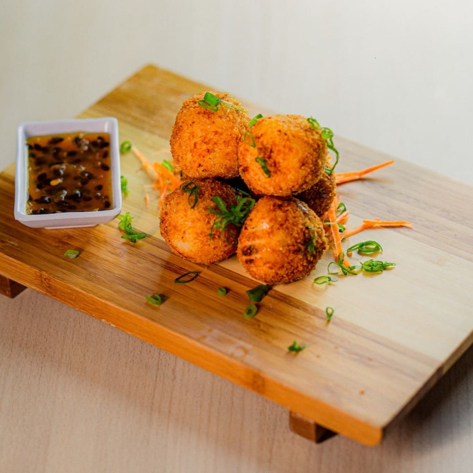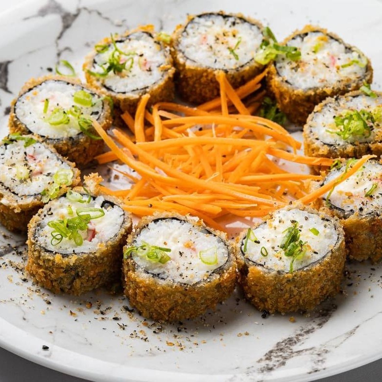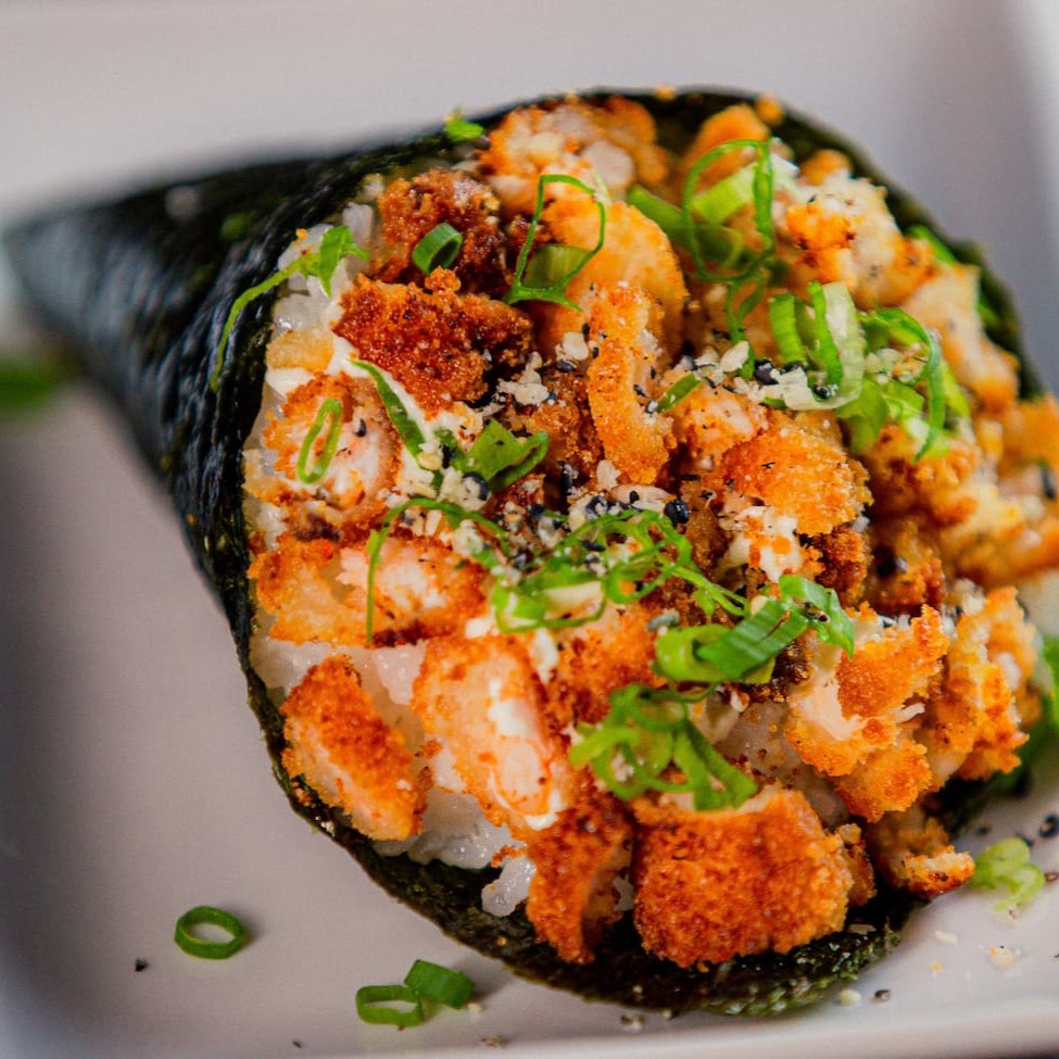 Salmão maçaricado, arroz, camarão crocante, cream cheese e cebolinha