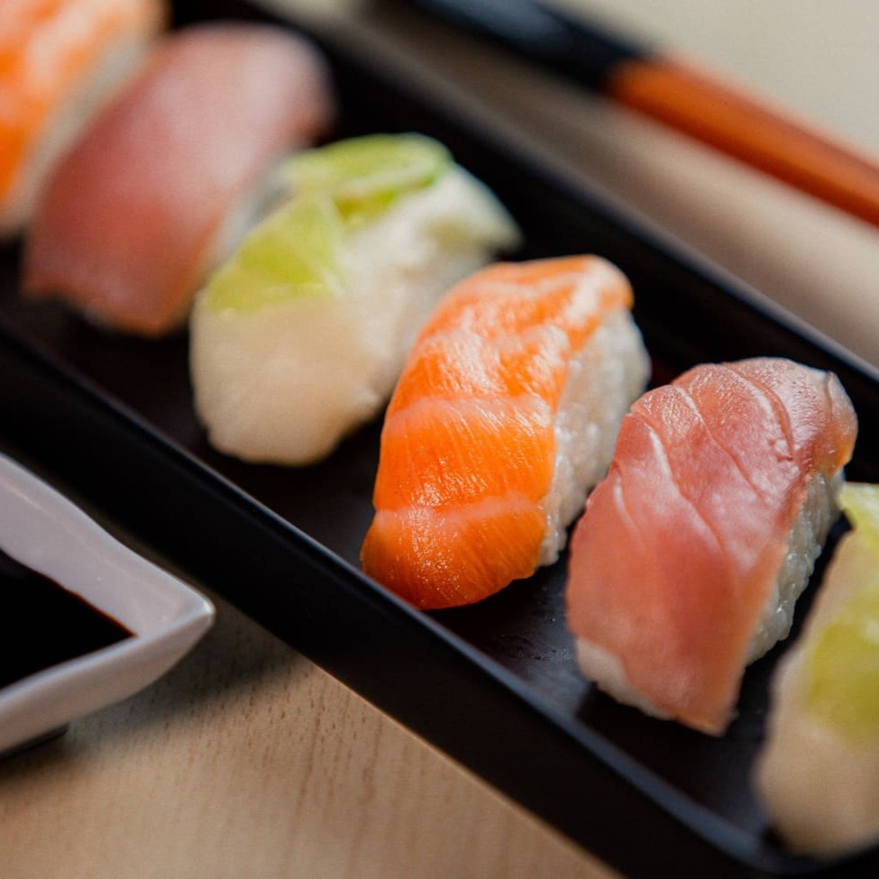 2 niguiri de salmão, 3 sashimis, 5 Philadelphia, 5 hossomaki, 5 hot carioca,