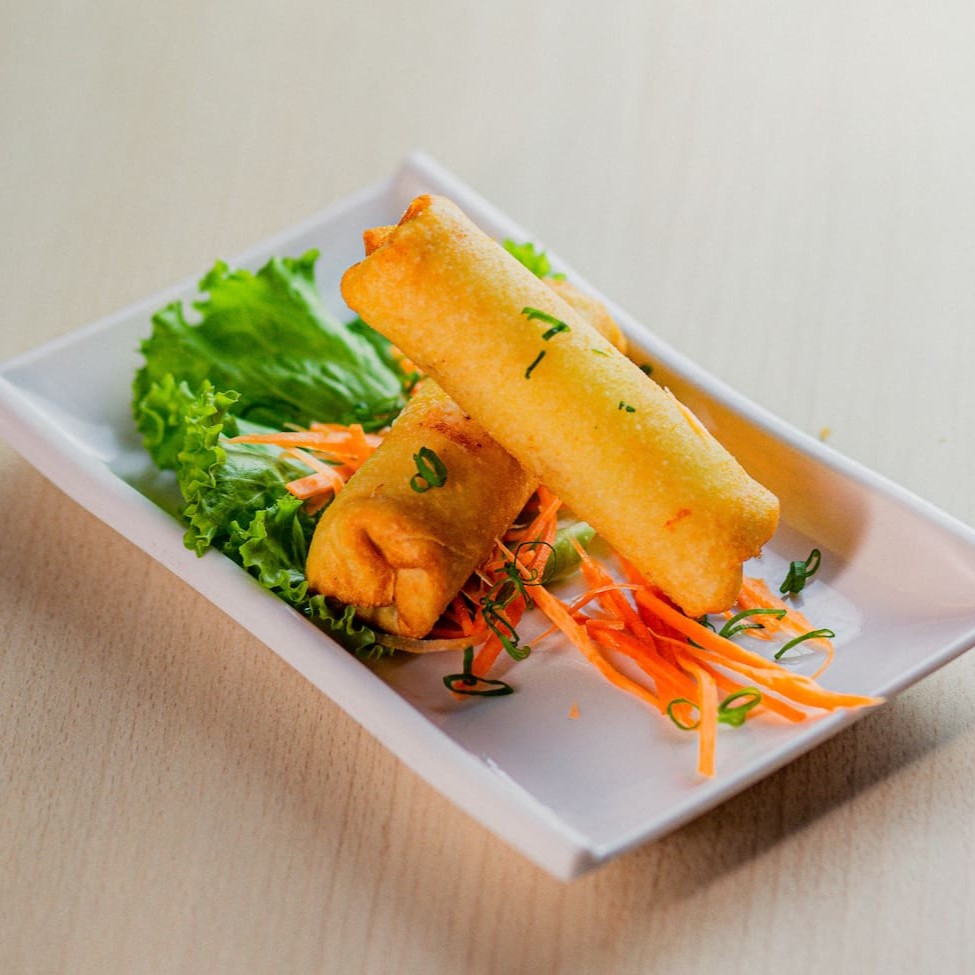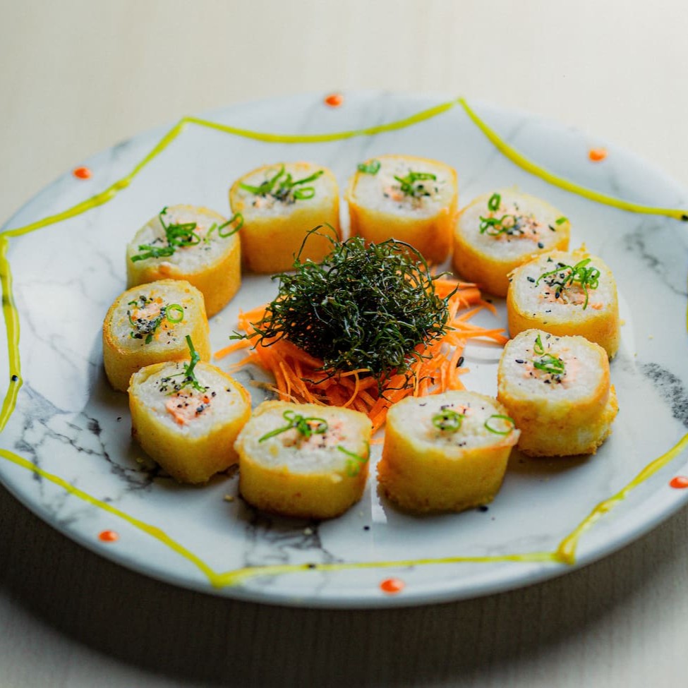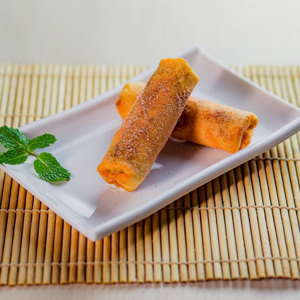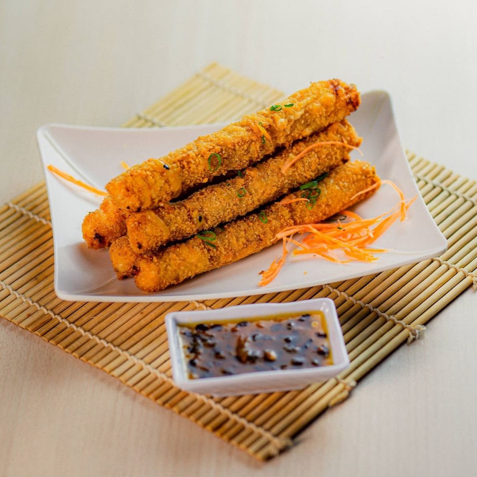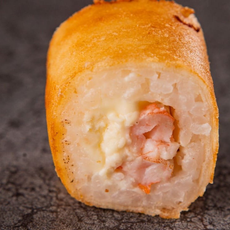 Massa de harumaki, camarão, arroz, cream cheese e cebolinha