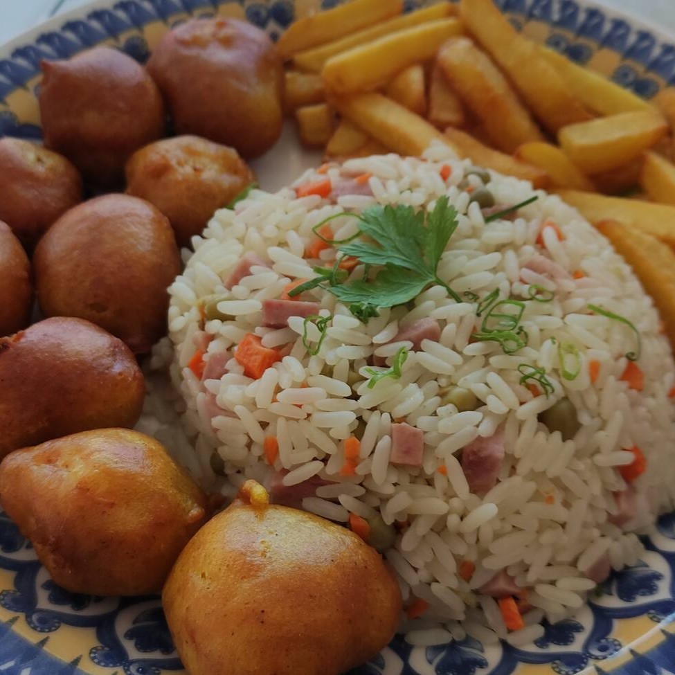 Cubos de salmão, arroz, cream cheese e cebolinha