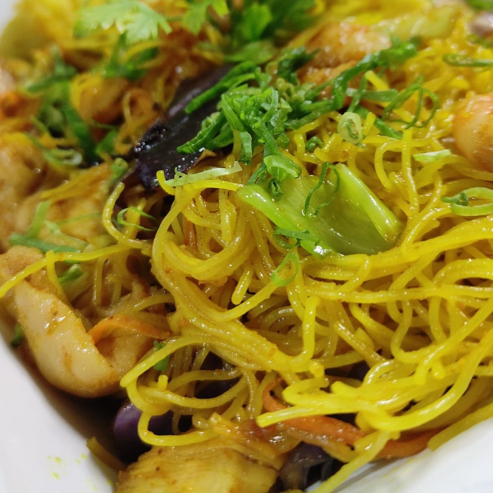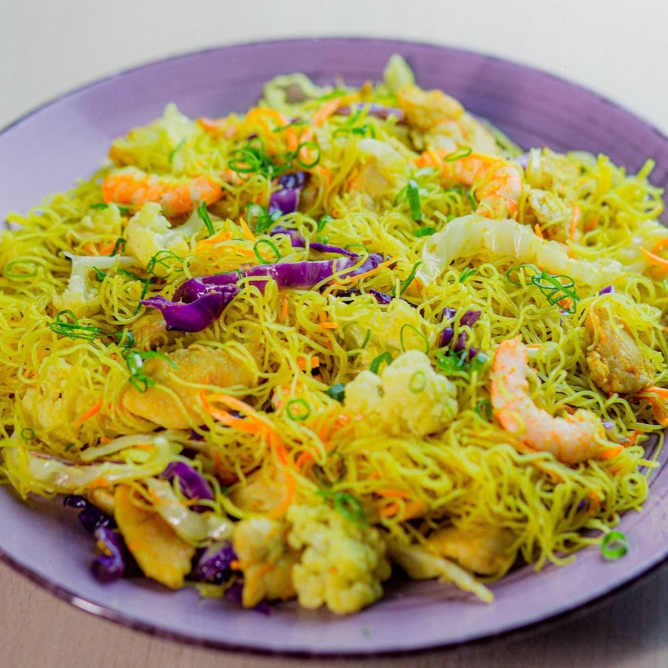 Macarrão bifum temperado no curry frango, camarão e legumes.( couve flor, repolho e cenoura ralada.)