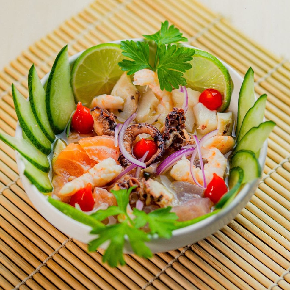 Salmão, atum, peixe branco, camarão, polvo, molho citrico, pimenta biquinho, cebola roxa