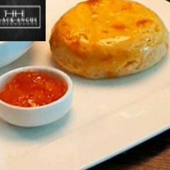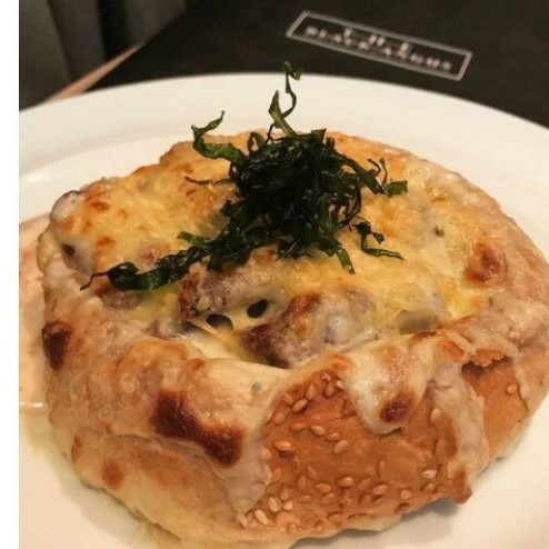 Ao molho de queijo, gratinado com parmesão servido no pão.