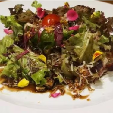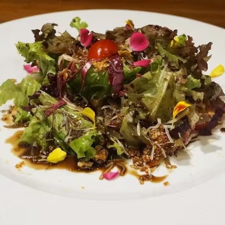 Folhas variadas, tomate cereja, queijo parmesão, praline de amêndoas e molho agridoce.
