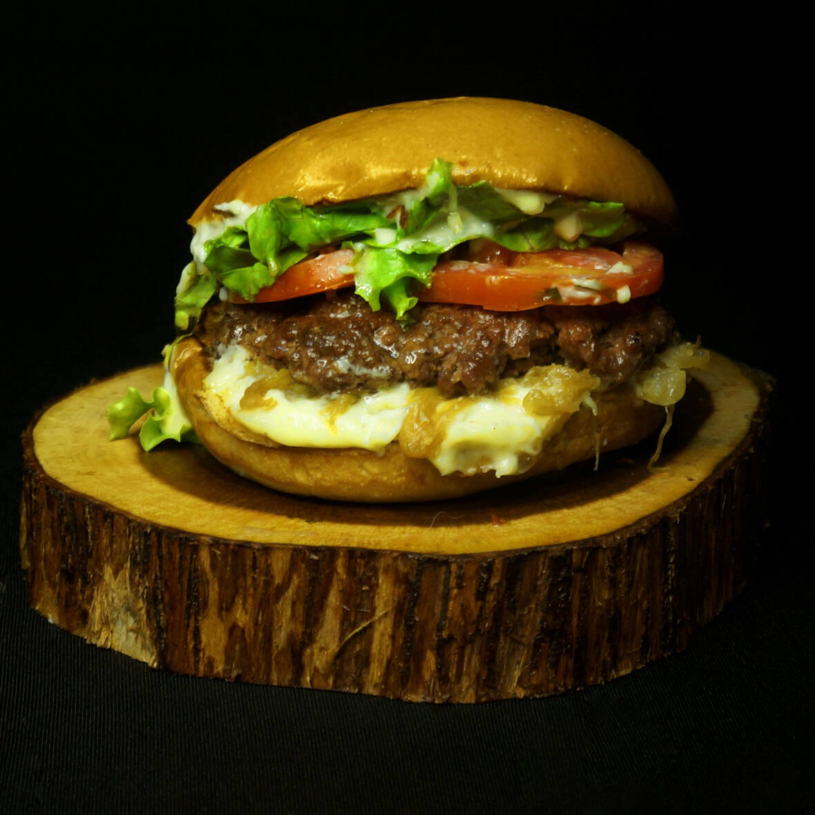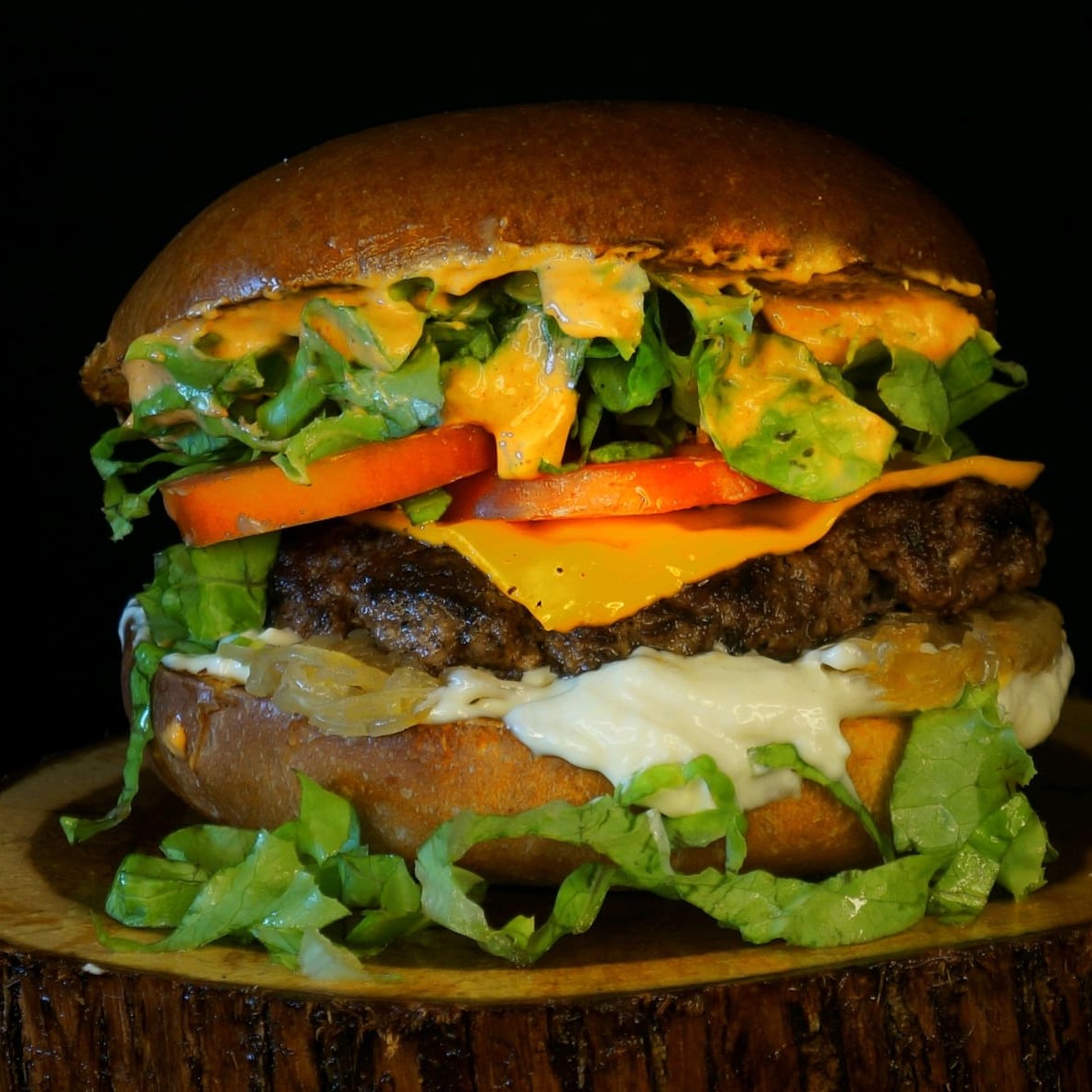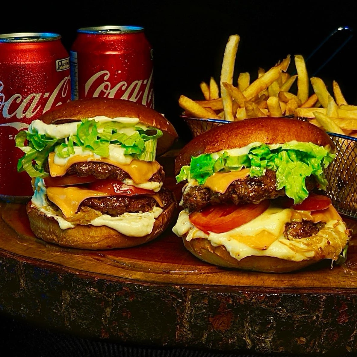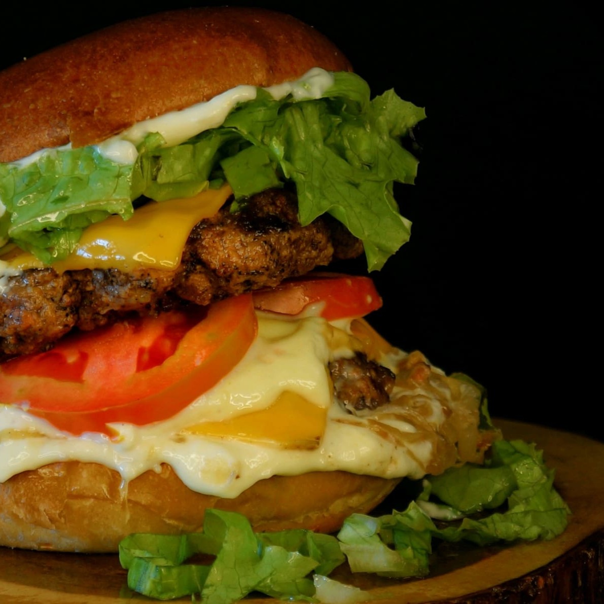 São 2 blends de 100 gramas suculentos e saborosos, 2 fatias de cheddar cremoso, cebola frita caramelizada, alface e tomate do Dia, nossa queridinha maionese feita na casa e pão brioche tostado na manteiga!