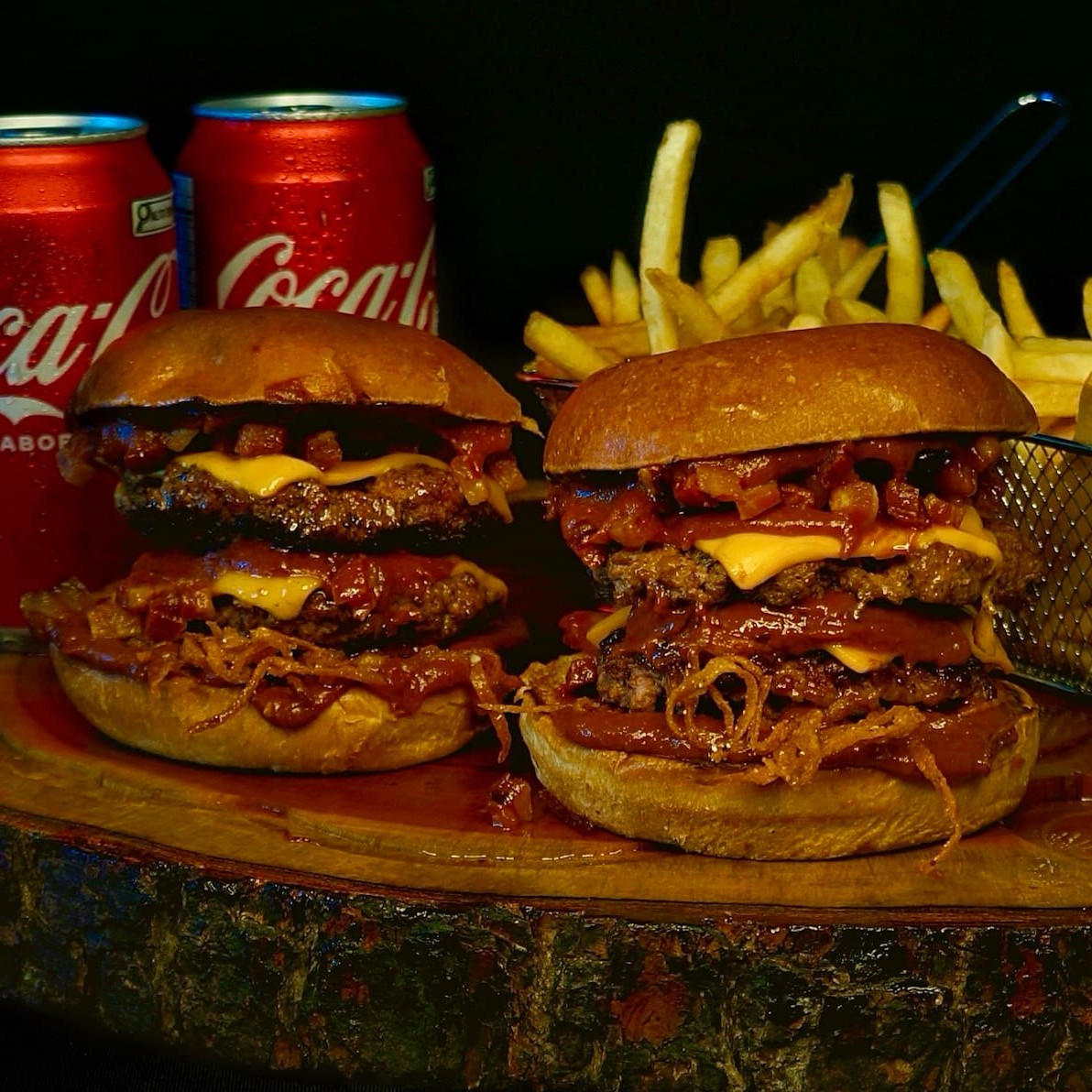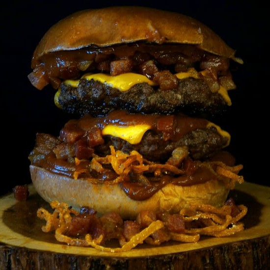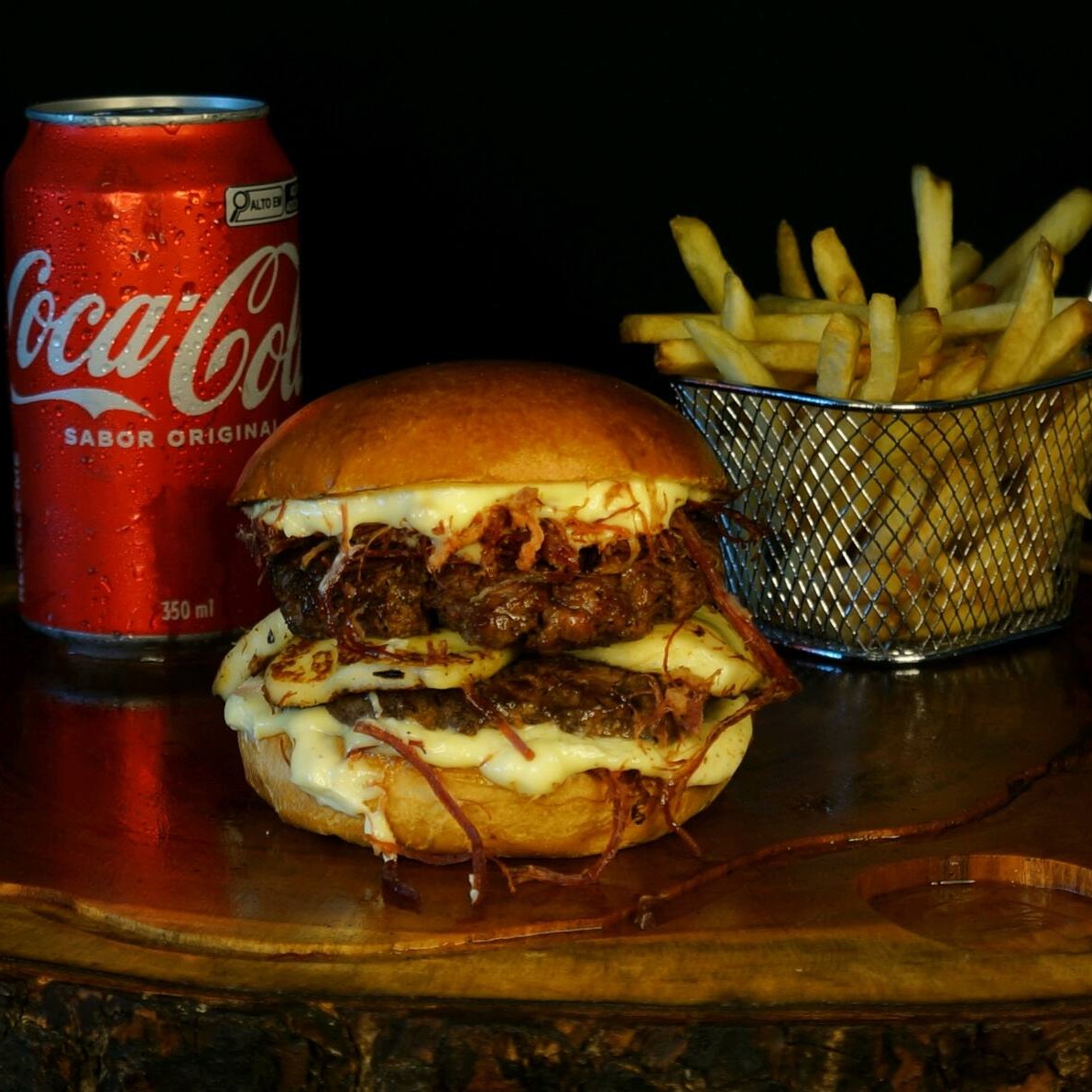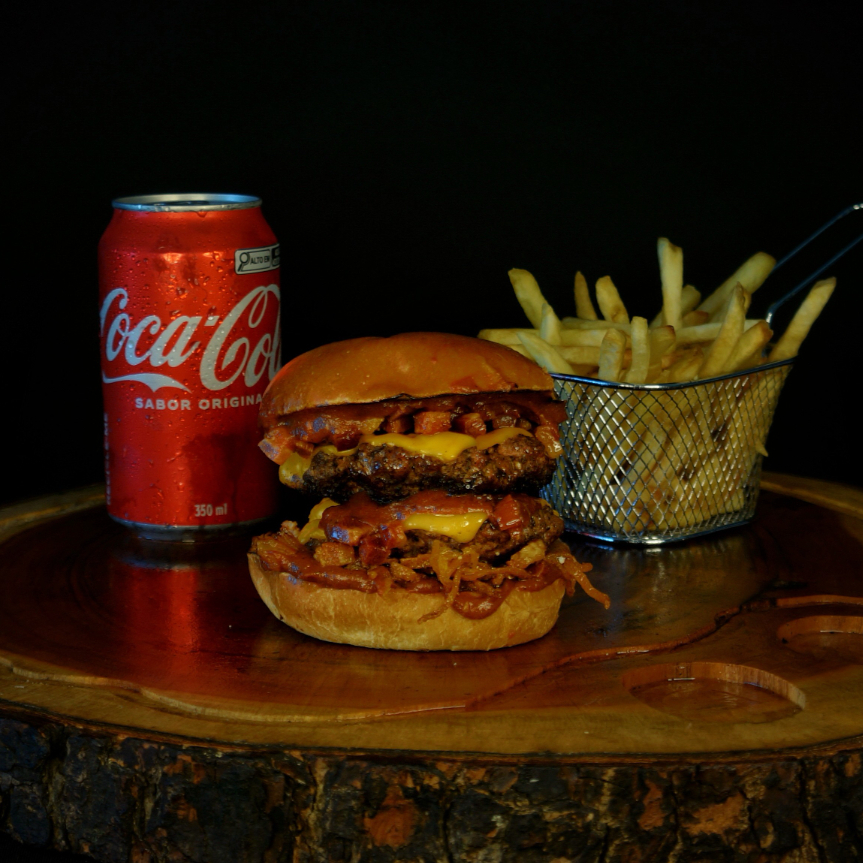 São 2 blends de 100 gramas suculentos e saborosos, 2 fatias de cheddar cremoso, cebola crispy super crocante feita na casa, bacon em cubos crocante, barbecue feito de maneira artesanal e pão brioche tostado na manteiga.