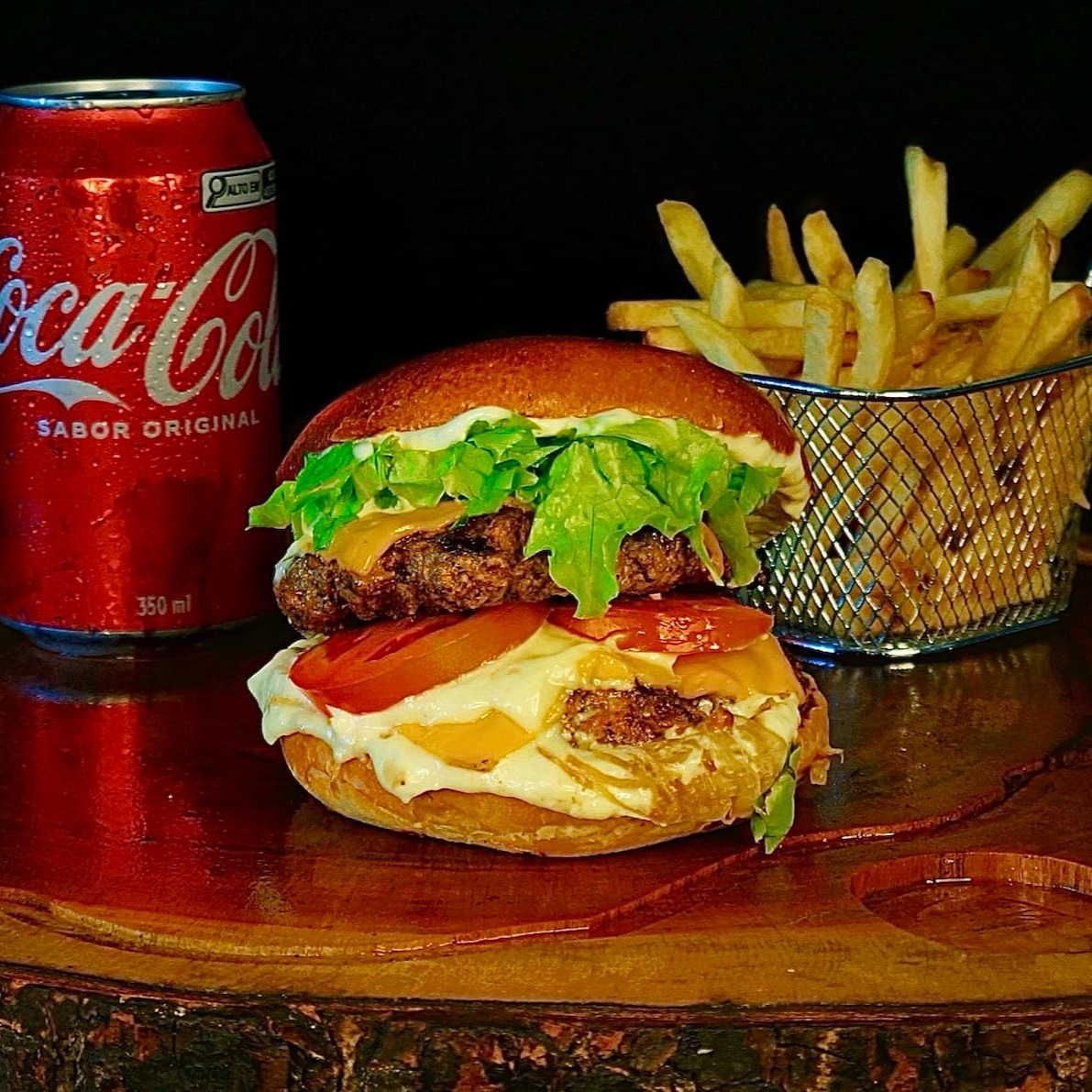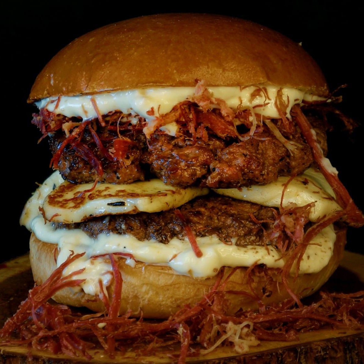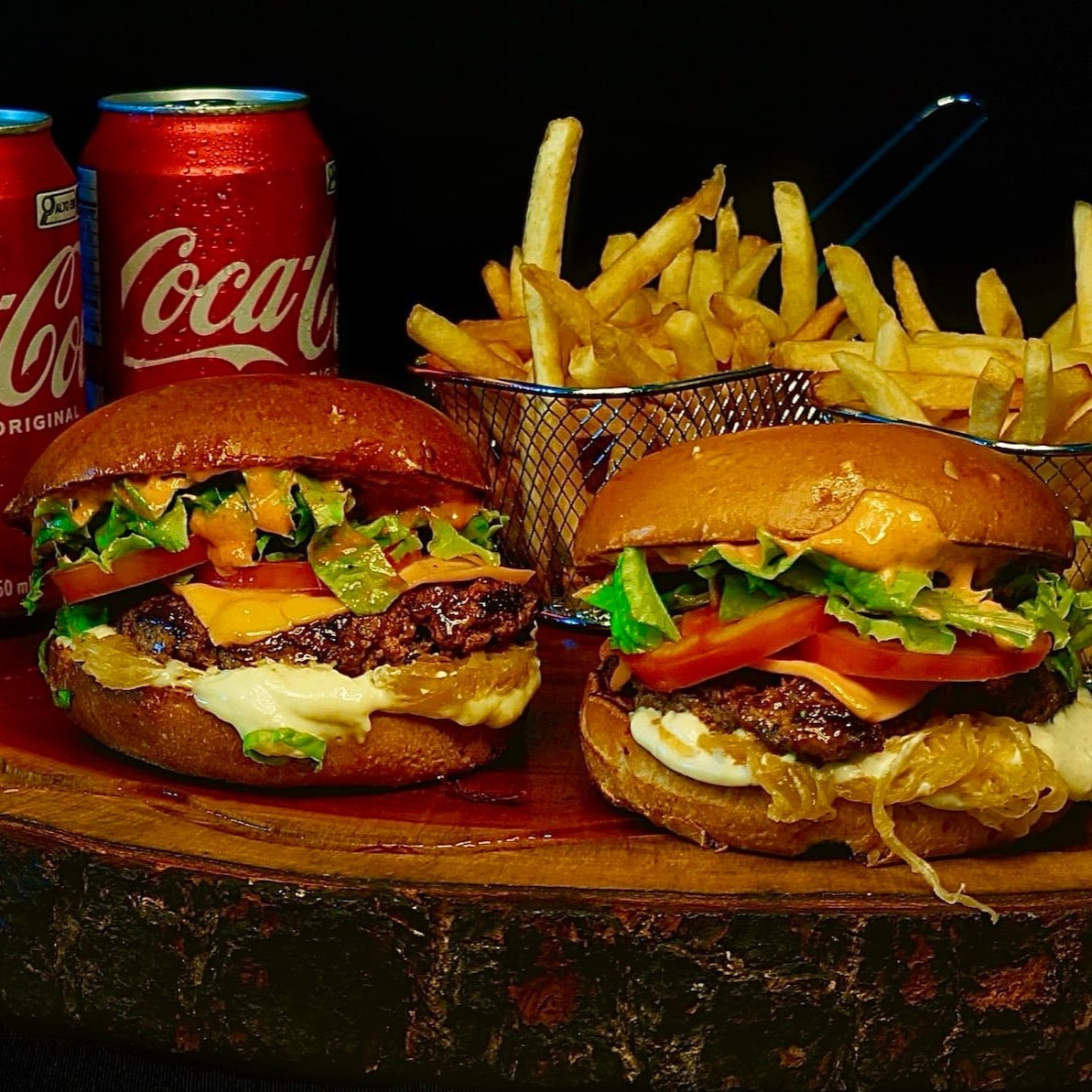 São 2 blends de 100 gramas suculentos e saborosos, 2 fatias de cheddar cremoso, cebola crispy super crocante feita na casa, bacon em cubos crocante, barbecue feito de maneira artesanal e pão brioche tostado na manteiga.