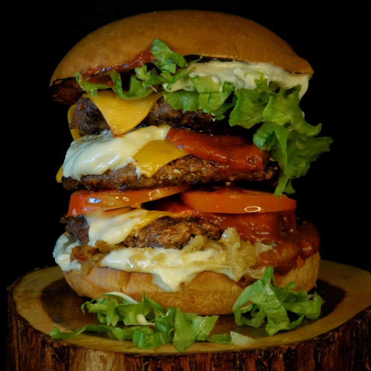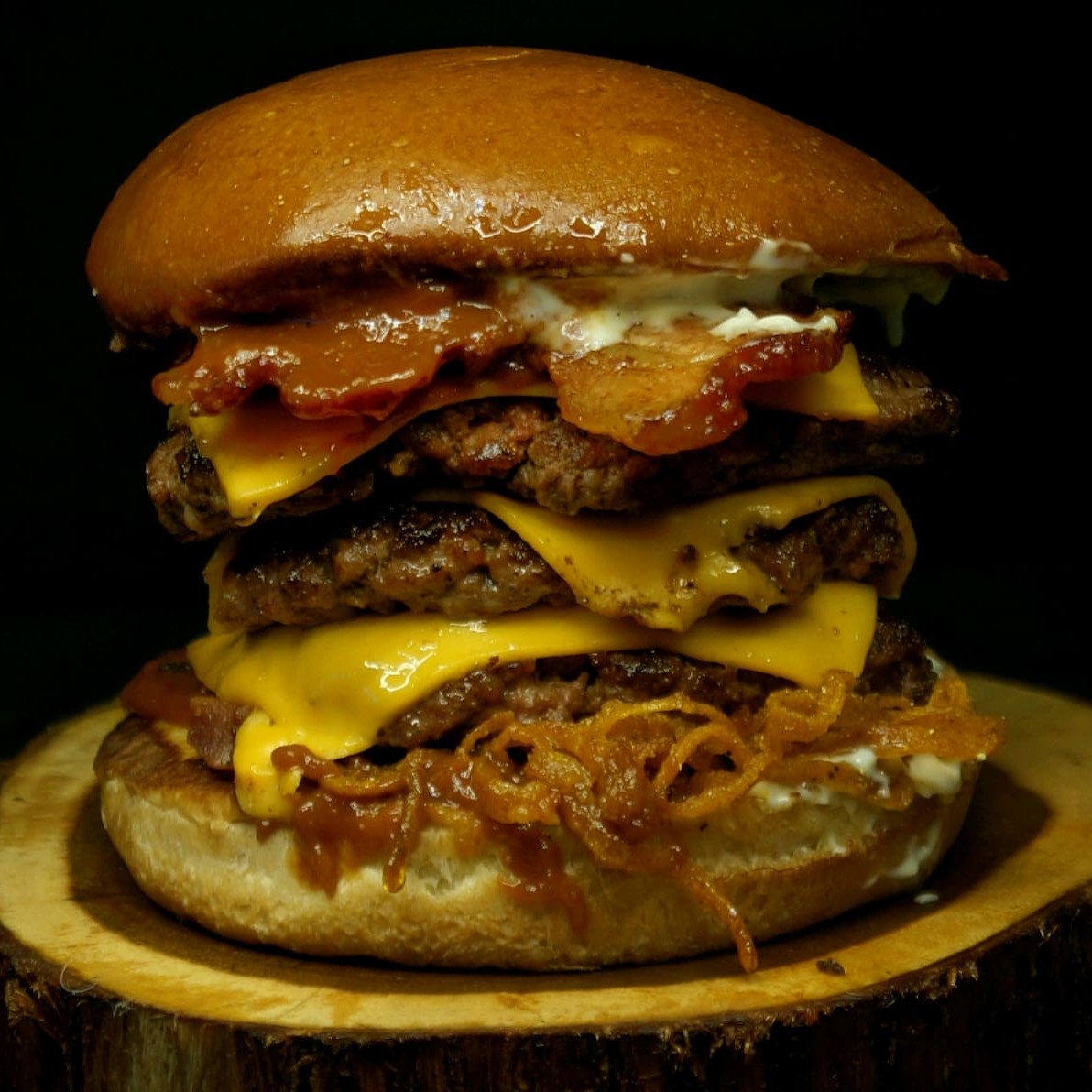 São incríveis 3 blends de 100 gramas suculentas e saborosas, 3 fatias de cheddar cremoso, nossa famosa cebola crispy temperada, bacon em tiras crocantes, barbecue feito de maneira artesanal, nossa queridinha maionese caseira e pão brioche tostado na chapa.