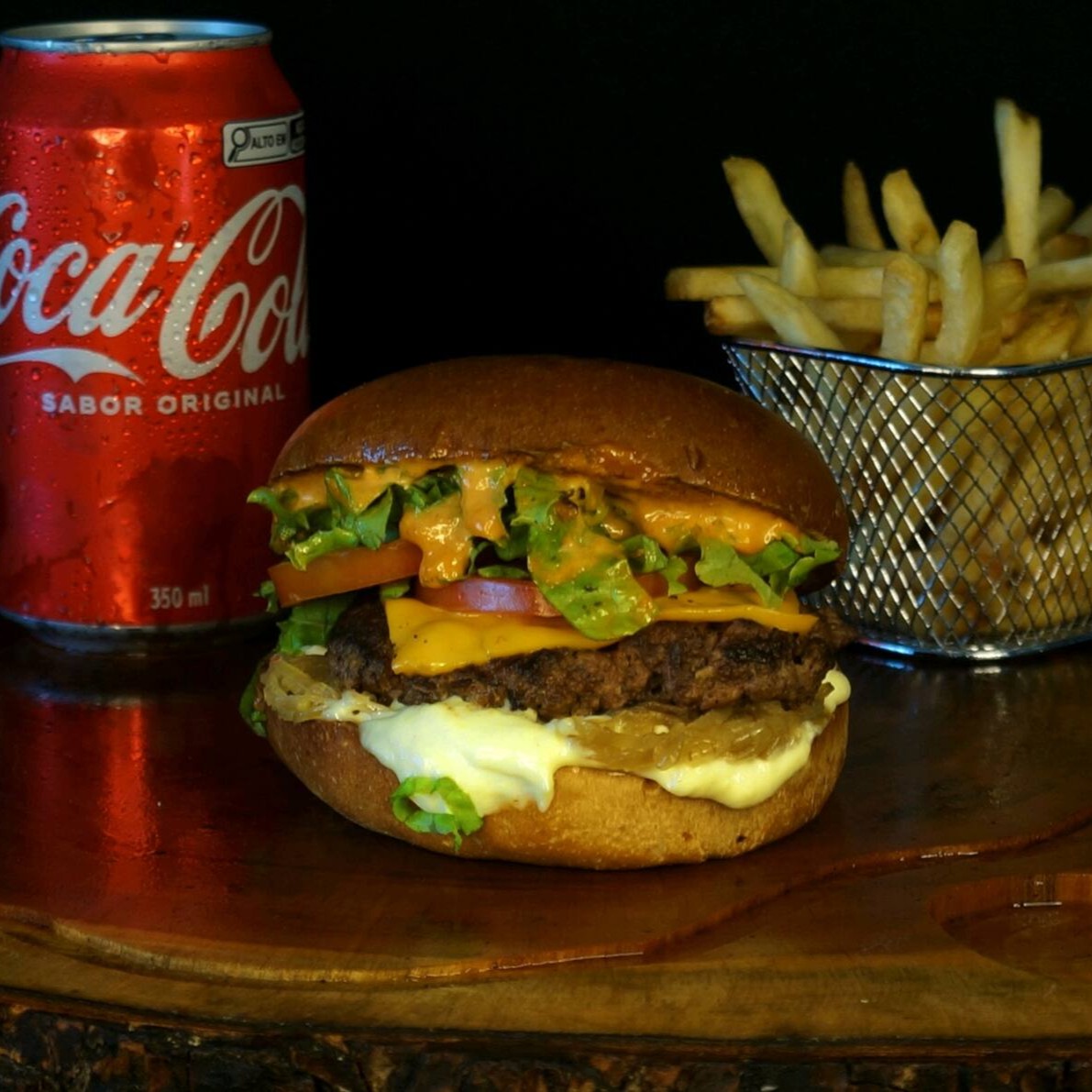 Blend de 100 gramas suculento e saboroso, uma fatia de cheddar cremoso, cebola caramelizada, alface e tomate do Dia, maionese secreta da casa e pão brioche tostado na manteiga!