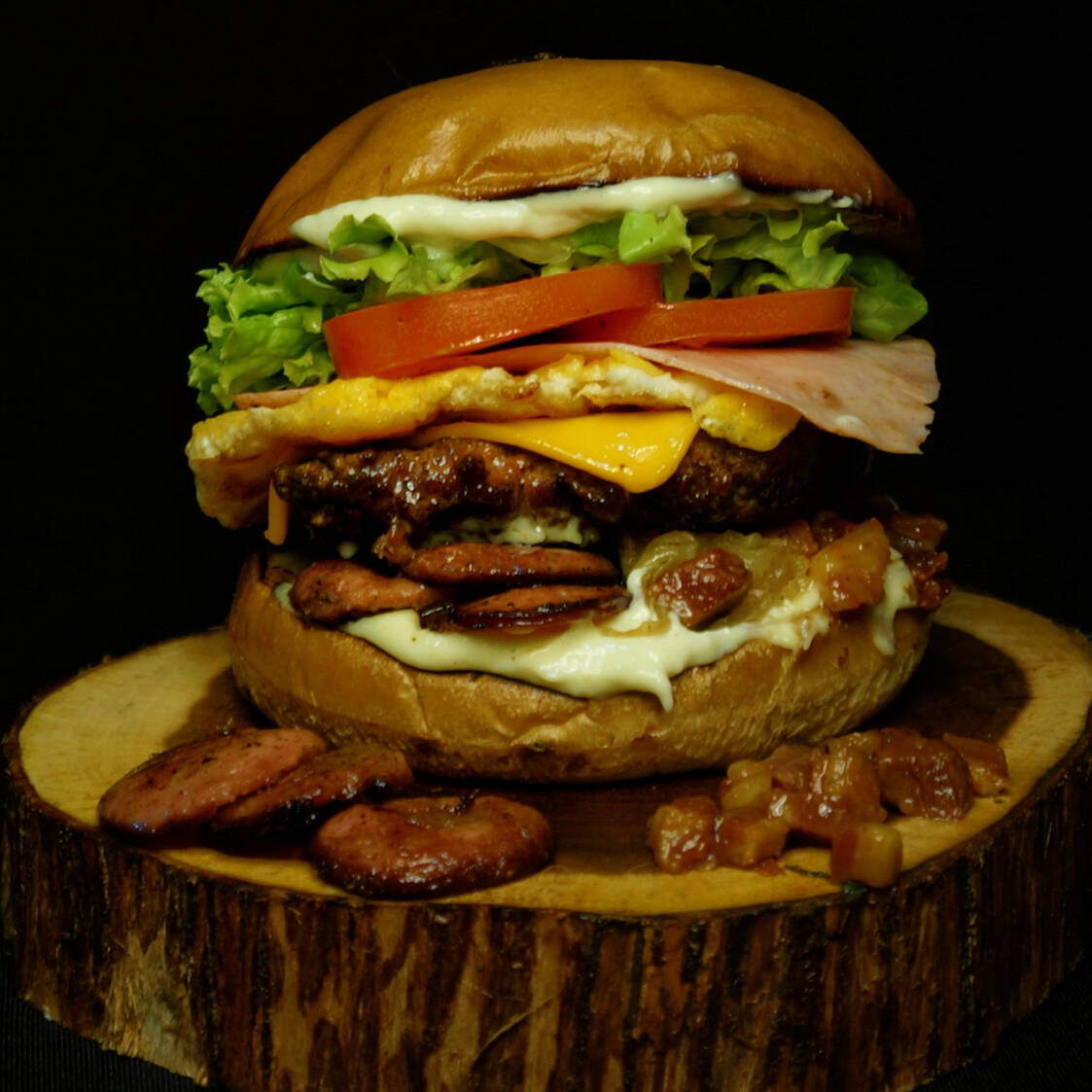 Pão Quantum Tostado na Chapa, Blend Artesanal de 100g, Bacon em Cubos Pequenos, Calabresa Refogada, Ovo Frito na Chapa, Presunto de Peru, Queijo Cheddar Polenghi, Molho Especial da Casa, Alface do Dia, rodelas de tomate fresquinhos e cebola caramelizada.