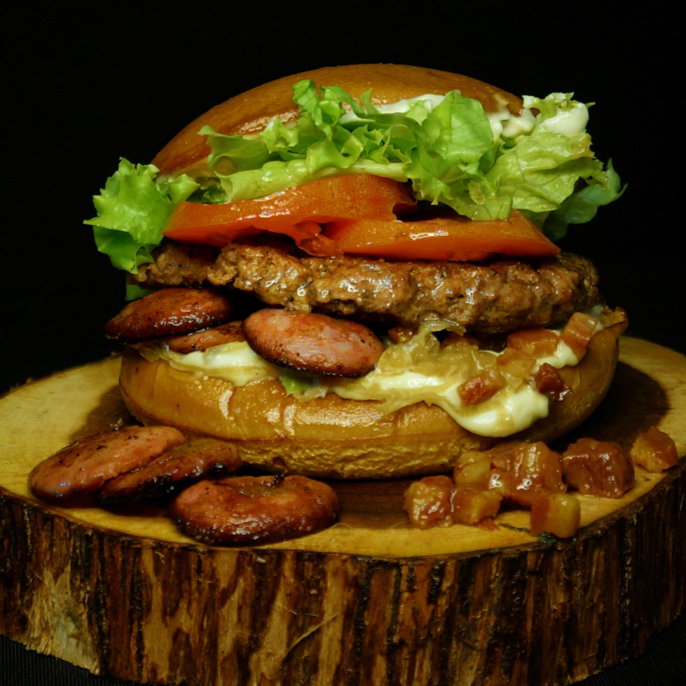 Pão Quantum Tostado na Chapa, Blend Artesanal de 100g, Bacon em Cubos, Calabresa Refogada, Molho Especial da Casa, Alface do Dia, rodelas de tomate fresquinhos e cebola caramelizada.(Caso queira retirar algum ingrediente, especificar nas observações)