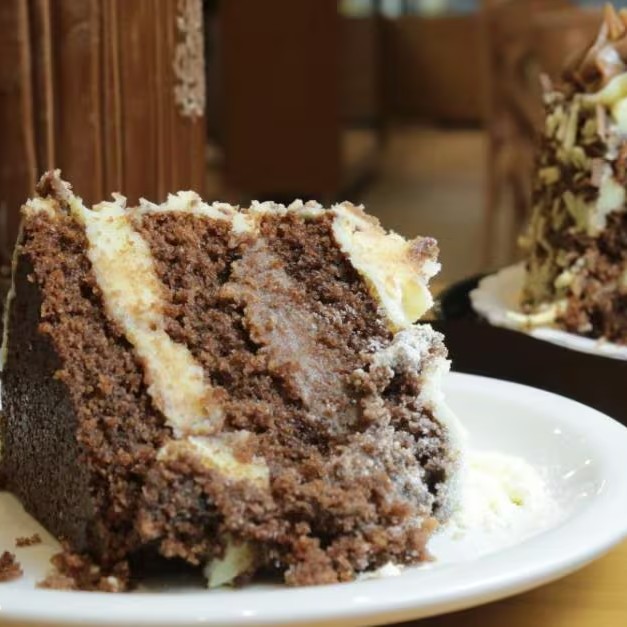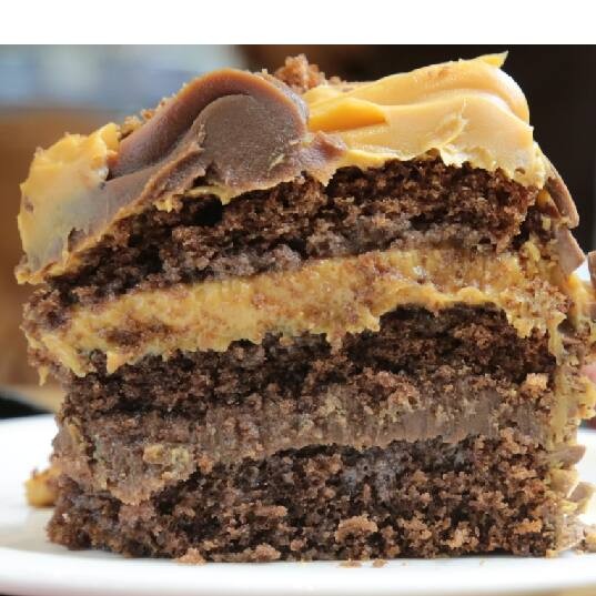 Generosa fatia de uma torta feita com bolo bem umedecido com leite integral, recheada com um creme especial à base de leite condensado e creme de leite, e cobertur de brigadeiro de leite Ninho,