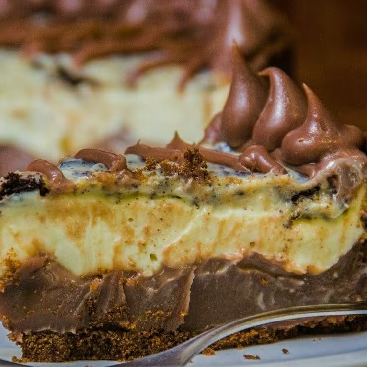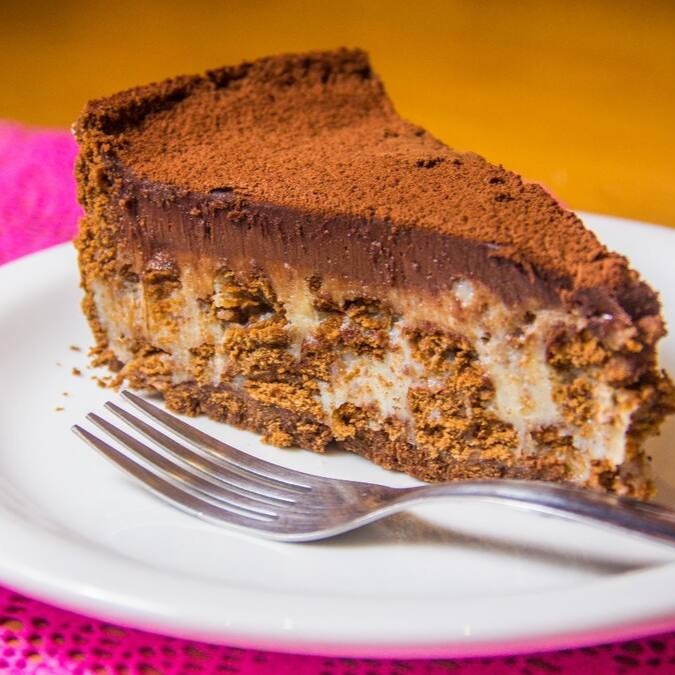 Base de biscoito de chocolate, recheio de brigadeiro de chocolate belga e creme brulêe, coberta com ganache de chocolate branco e pedaços de biscoito Negresco