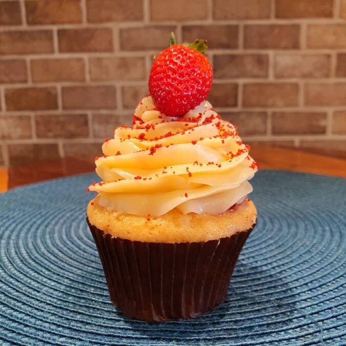 Delicioso bolinho branco recheado e coberto com brigadeiro de Ninho e geleia de morango.