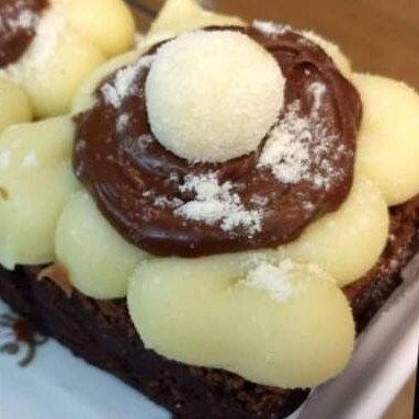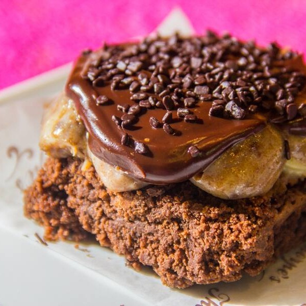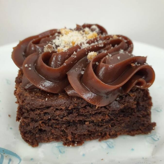 Brownie tradicional coberto com o exclusivo brigadeiro africano e ganache de de chocolate meio amargo