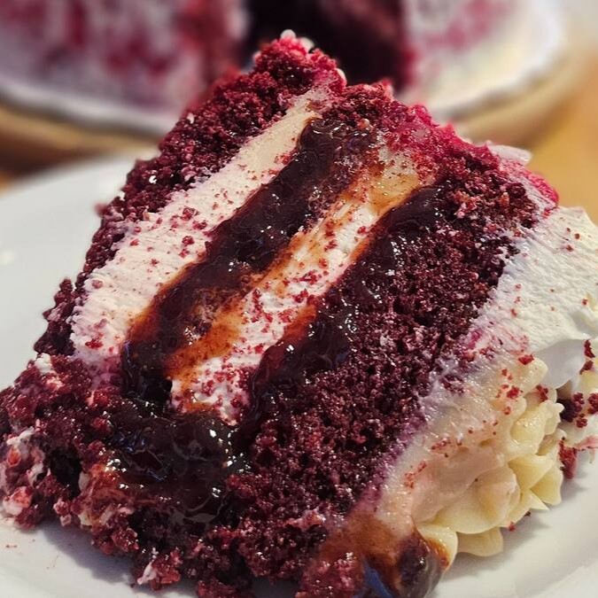 Deliciosa fatia da nova torta red velvet, feita com uma massa aveludada e molhadinha do bolo vermelho, recheio de mousse de cream cheese e geleia de morango, coberta com chocolate branco.