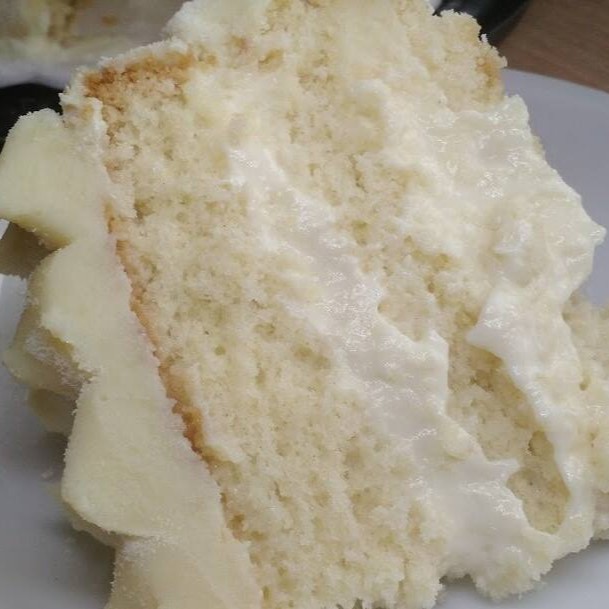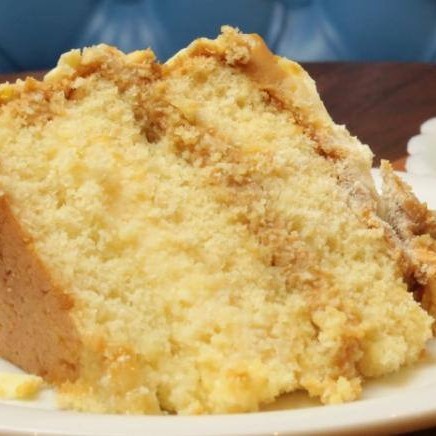 Fatia de um bolo branco recheado brigadeiro branco e crocante de amendoim caramelizado (não contém chocolate)