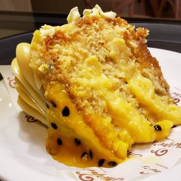 Fatia de um bolo branco recheado com mousse de maracujá, coberto com raspas de chocolate branco. Uma combinação perfeito do doce com o azedinho do maracujá.