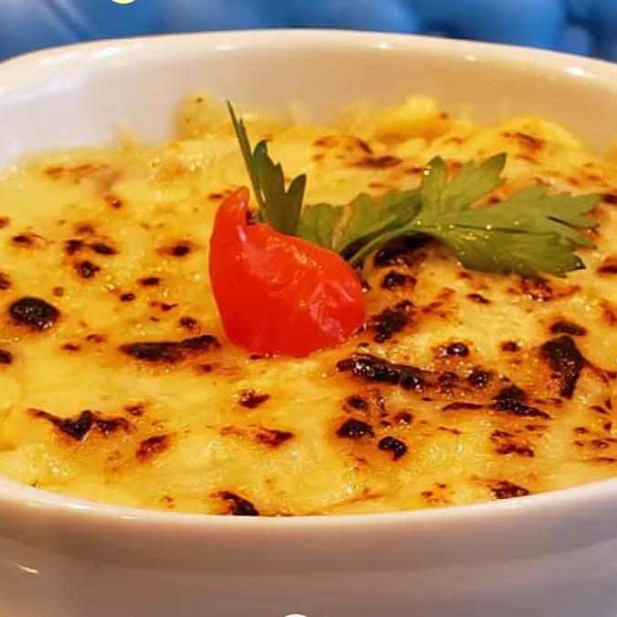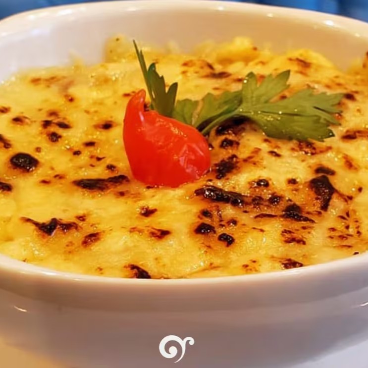 Aprox. 250g de uma porção de um delicioso creme de macaxeira com carne de charque desfiada, coberto com um blend de queijo maçaricado. Ótima opção de refeição
