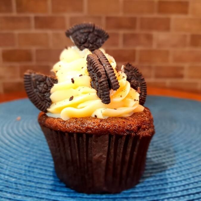 Delicioso bolinho de chocolate recheado e coberto com brigadeiro branco e pedaços de biscoito Oreo
