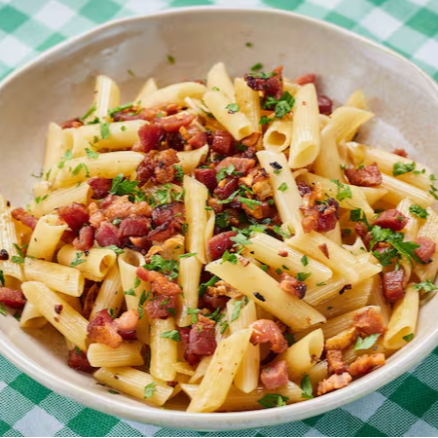 Penne al dente com alho dourado e crocantes pedaços de bacon, criando uma combinação simples e irresistível.