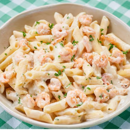 Penne al dente envolvido em um cremoso molho de camarão, harmonizado com a combinação de três queijos que derretem na boca.
