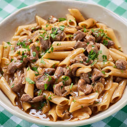 Penne delicadamente servido com tiras de carne suculenta, champignon fresco, resultando em uma experiência sofisticada.