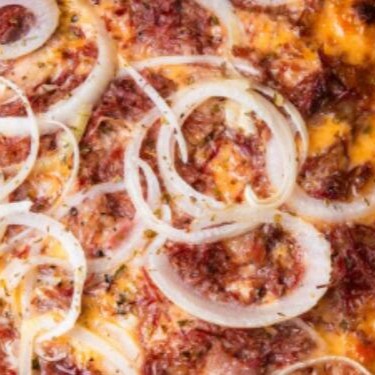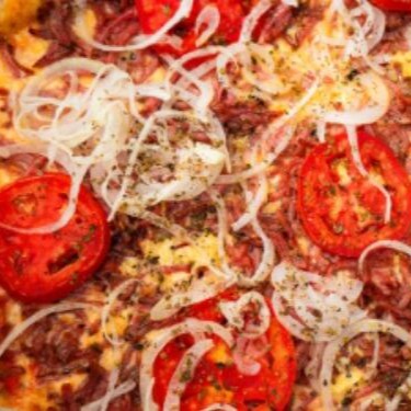 Pizza media de Baiana - Molho De Tomate, Mussarela, Orégano, Azeitona, Calabresa Moída, Tomate E Cebola