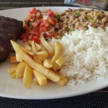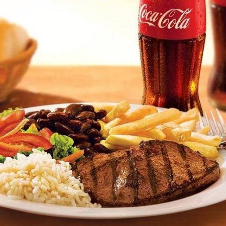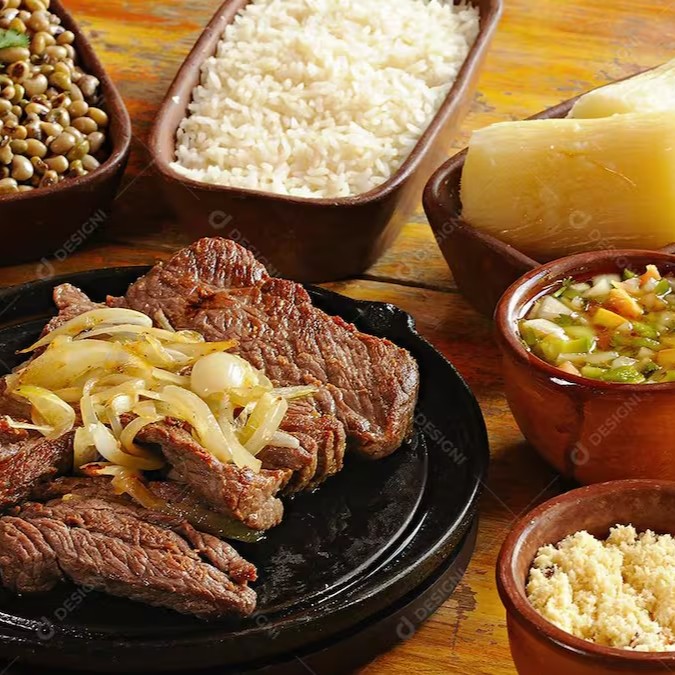 Feijão, arroz, verdura vinagrete, macarrão, farofa e batata frita