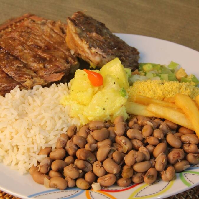 Deliciosa bisteca assada na brasa, acompanhada por feijão de corda sempre verde, arroz temperado, batata frita, farofa crocante e vinagrete fresquinho.