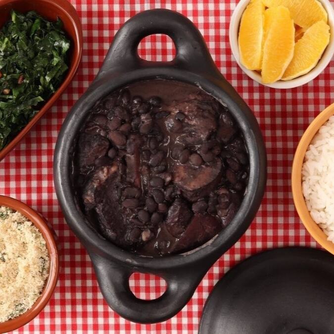 Delicioso feijão preto, adubado com ingredientes para feijoada, charque, pé suíno, orelha suína, rabo suíno, calabresa, paio e bacon. Acompanha arroz temperado, vinagrete fresquinho e farofa.