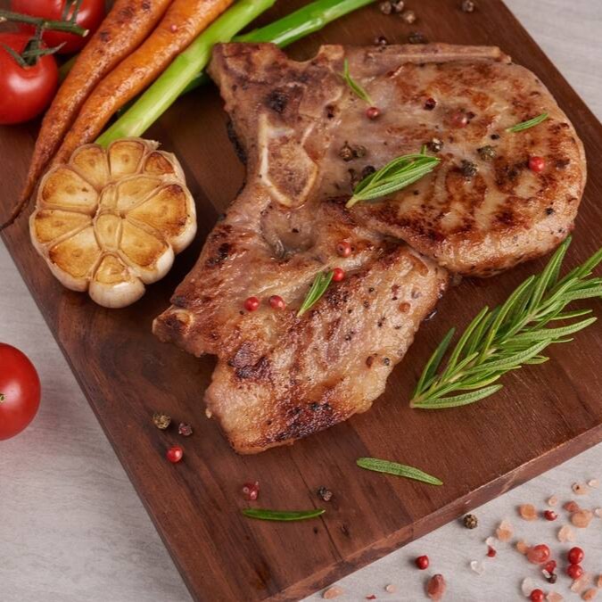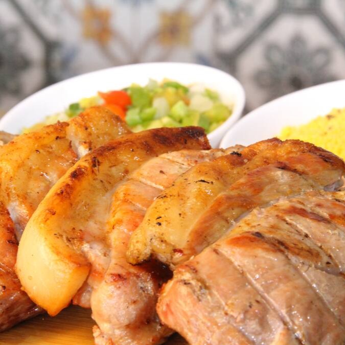 Deliciosa Bisteca suína assada na brasa (zero gordura) acompanhada por feijão de corda sempre verde, arroz temperado, farofa crocante e vinagrete fresquinho.