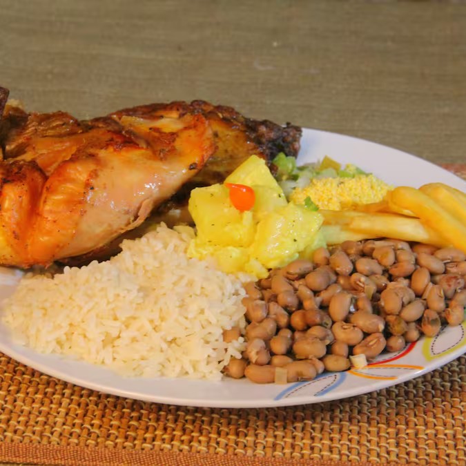 Delicioso galeto assado na brasa, acompanhado de feijão de corda, arroz temperado, farofa crocante e vinagrete fresquinho.