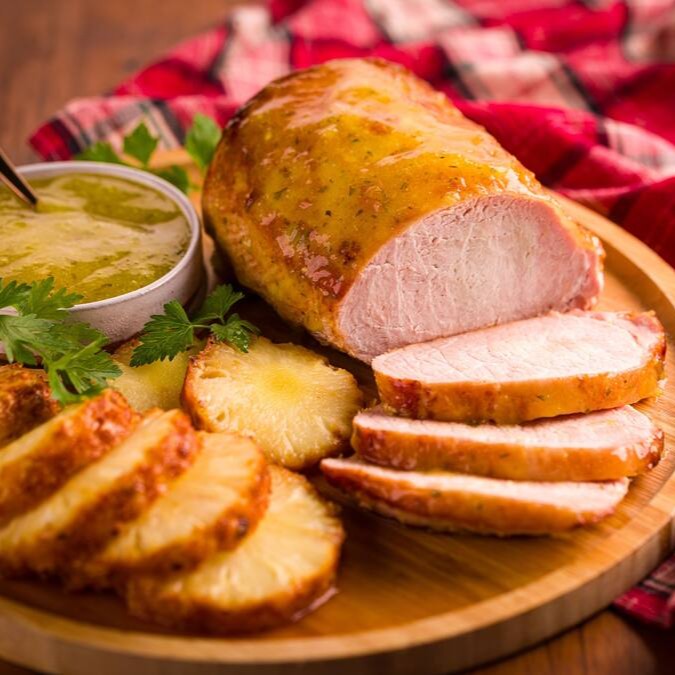 Delicioso lombo assado na brasa, acompanhado por feijão de corda sempre verde, arroz temperado, batata frita, farofa crocante e vinagrete fresquinho.