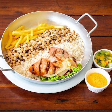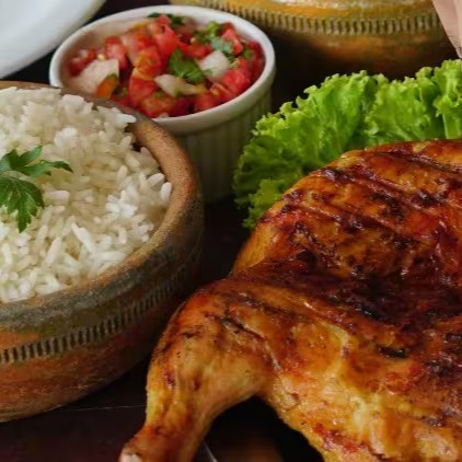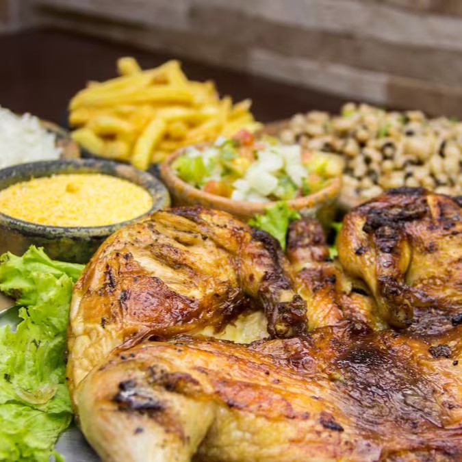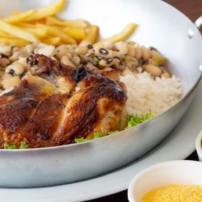 Galeto suculento na brasa, temperado com especiarias da casa. Acompanha arroz branco soltinho, feijão macassar, farofa da casa, batatas fritas crocantes e vinagrete fresco. Uma ótima opção para almoço ou jantar, com frete grátis.