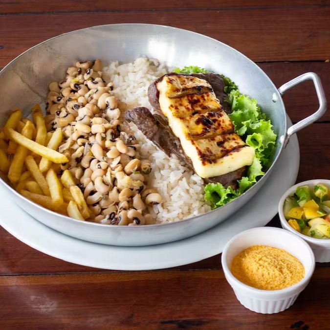 Carne de sol suculenta na brasa, servida com queijo coalho grelhado. Acompanha feijão macassar, arroz branco soltinho, farofa da casa, pirão de queijo cremoso, batatas fritas crocantes e vinagrete fresco. Perfeita para almoço ou jantar, com frete grátis.